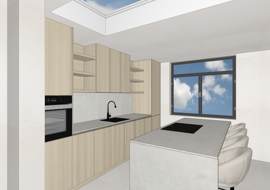 create a realistic rendering of a modern kitchen interior bathed in natural daylight incorporate a sleek minimalistic design with light oak wooden cabinets and soft beige undertones the countertops should be a subtle warm creme cemented stone a glossy black induction cooktop should be centered on the island include a matte black faucet over a stainless steel sink the large window should reveal a bright clear blue sky with fluffy white clouds the overall atmosphere should be fresh inviting and serene with a color palette of light greys soft beiges and bright airy blues