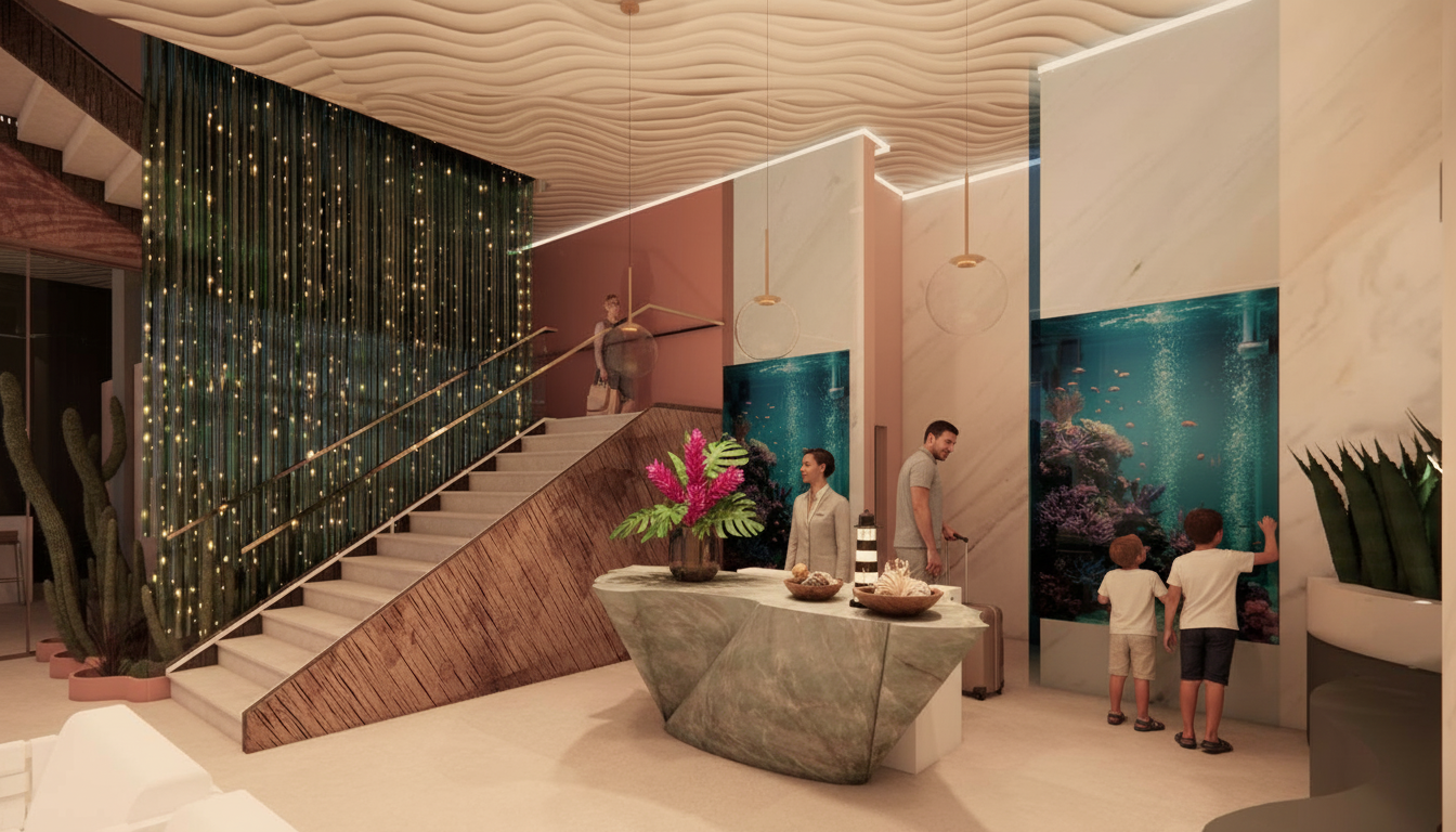 take the lights out of the hanging green glass turn on the lights about the reception desk