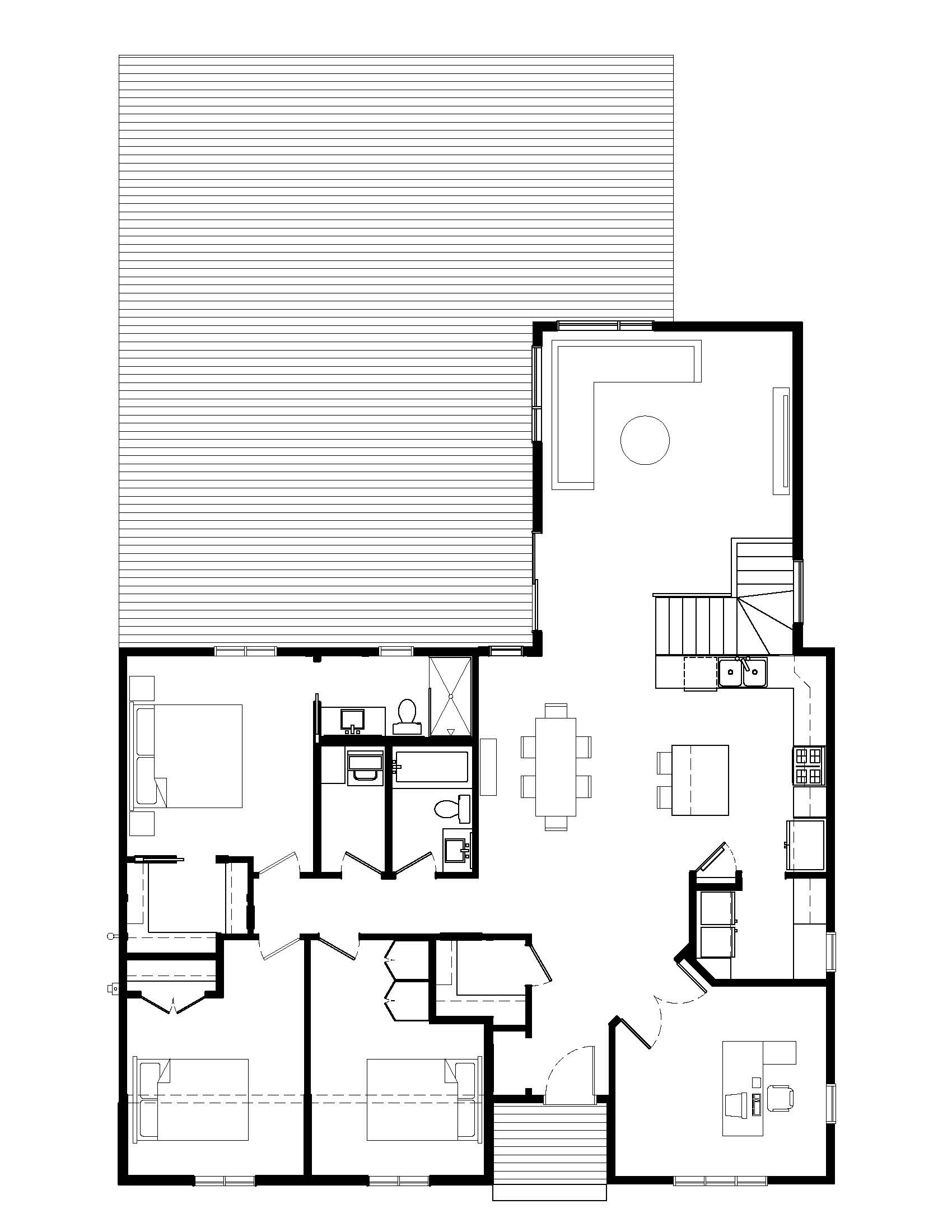 convert this floor plan into a realistic isometric 3d view of a full house show the space from an elevated angle with furniture walls and details visible use the same furniture as shows on the plan do not change the orientation of the floorplan