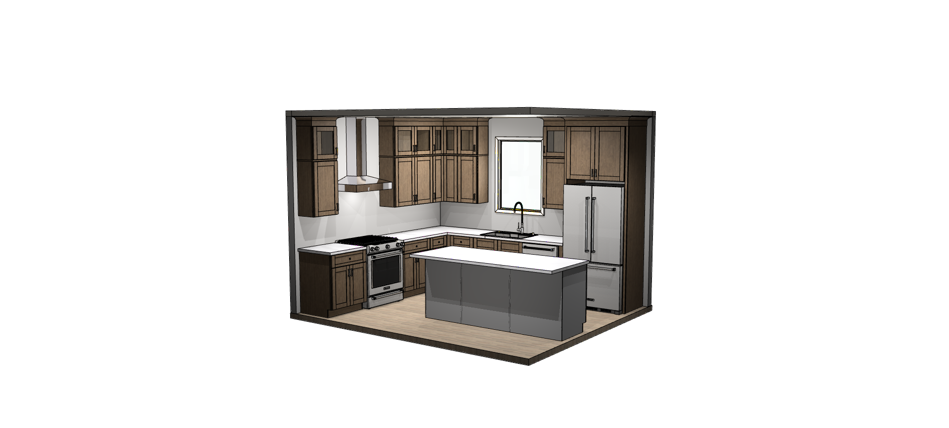 detail shot wall cabinets are a rustic knotty alder in a medium brown stain island is a medium to dark gray appliances are stainless steel countertops are white with a light gray veining