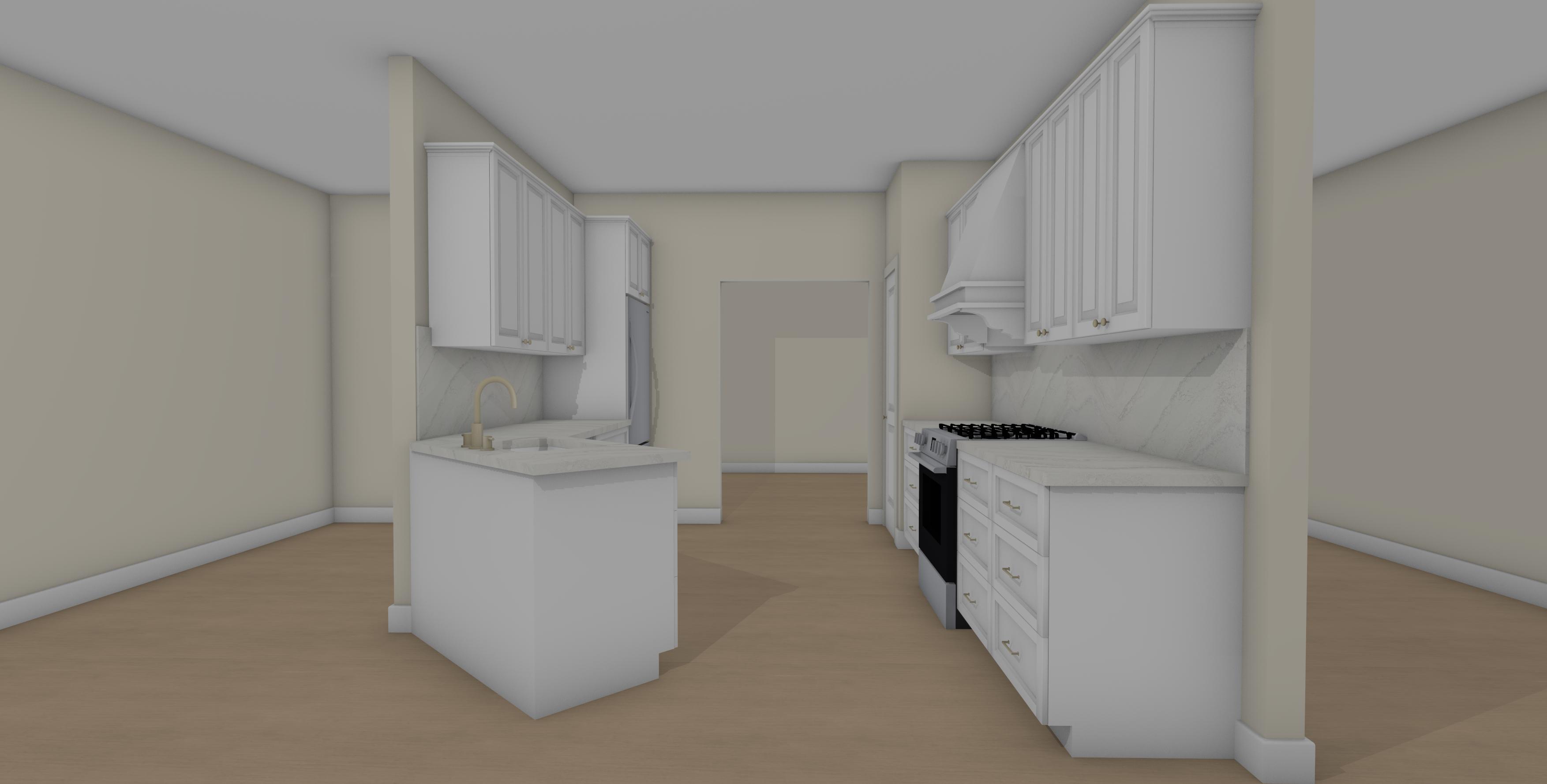 a modern kitchen with a cozy and welcoming atmosphere use warm beige walls with a light cream trim the cabinetry is a crisp white with gold handles the countertops are a polished white marble with subtle grey veining the flooring is a natural light oak wood include a stainless steel stove and a brushed gold faucet the overall lighting should be soft and inviting with ambient natural daylight filtering through