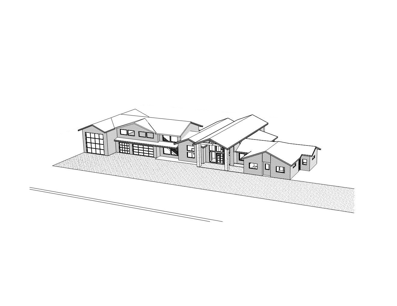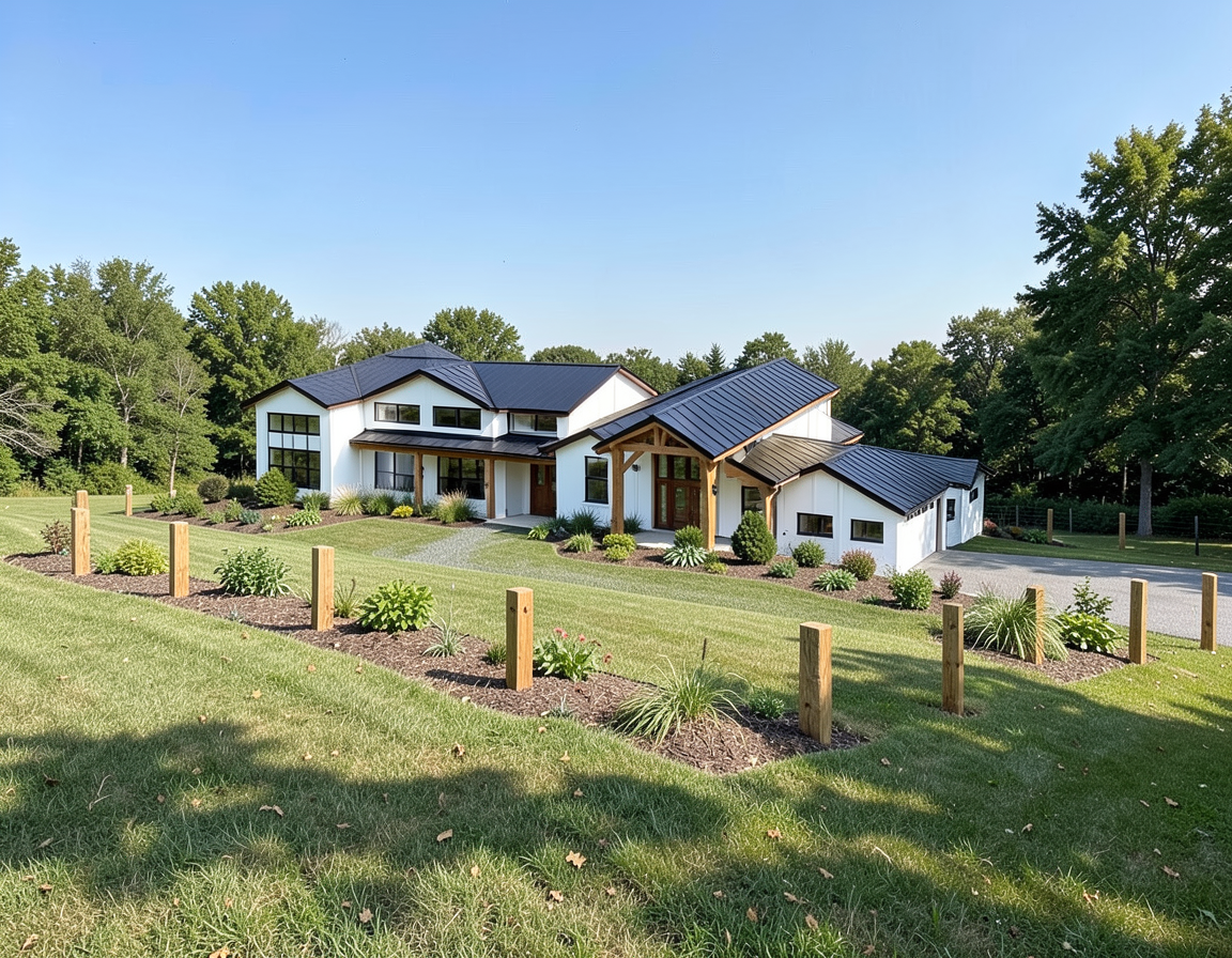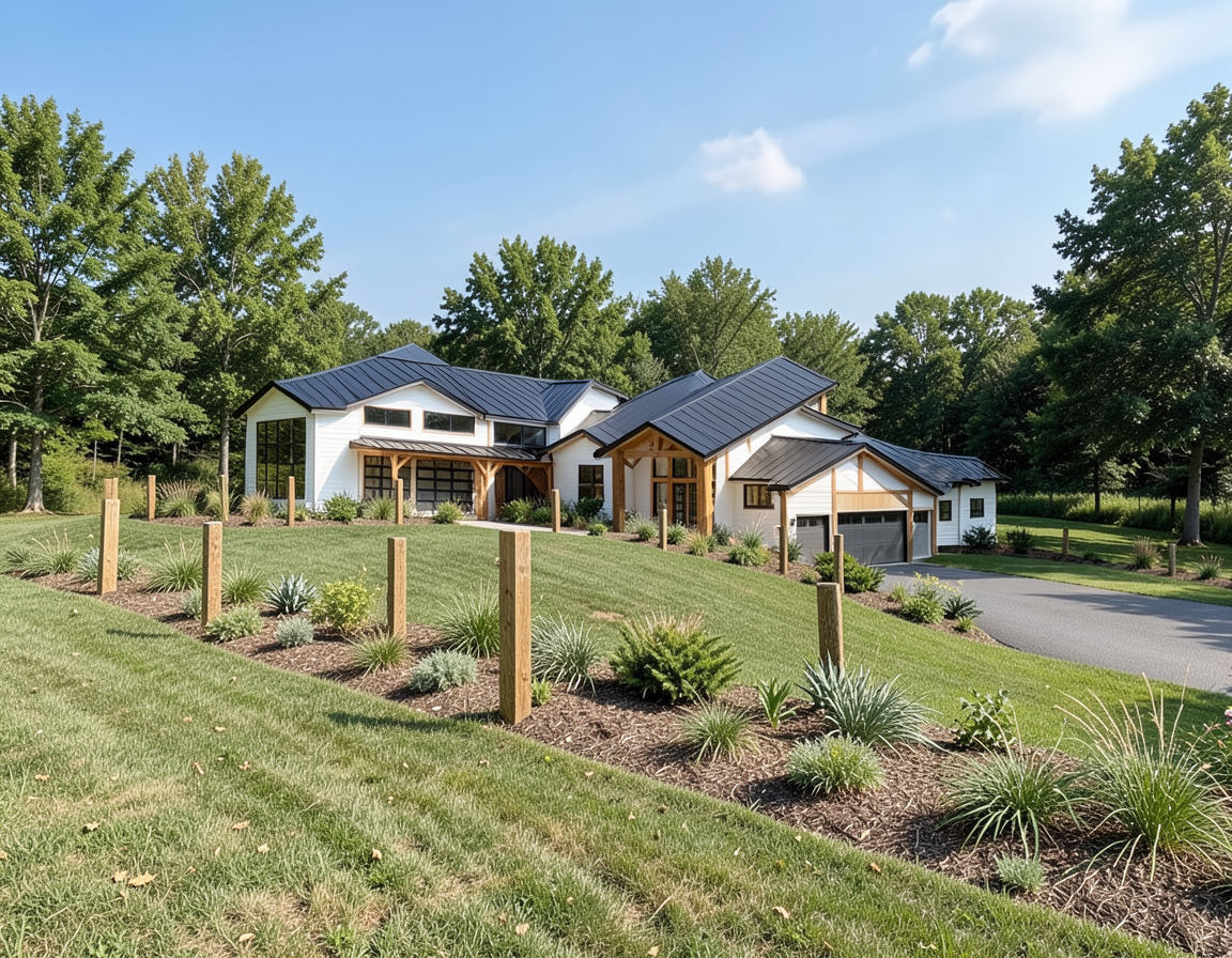 12 black standing seam roof white board and batten siding natural wood post and beams flat grassy landscape planting at perimeter and trees all posts to be natural wood to match driveway to entry driveway to garage