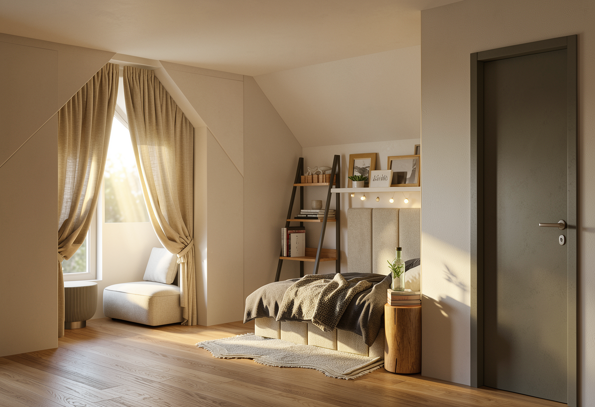 modernist exterior shot keep this same design but use a cornflower blue as the body and navy as the detail where the camel leather is architecture