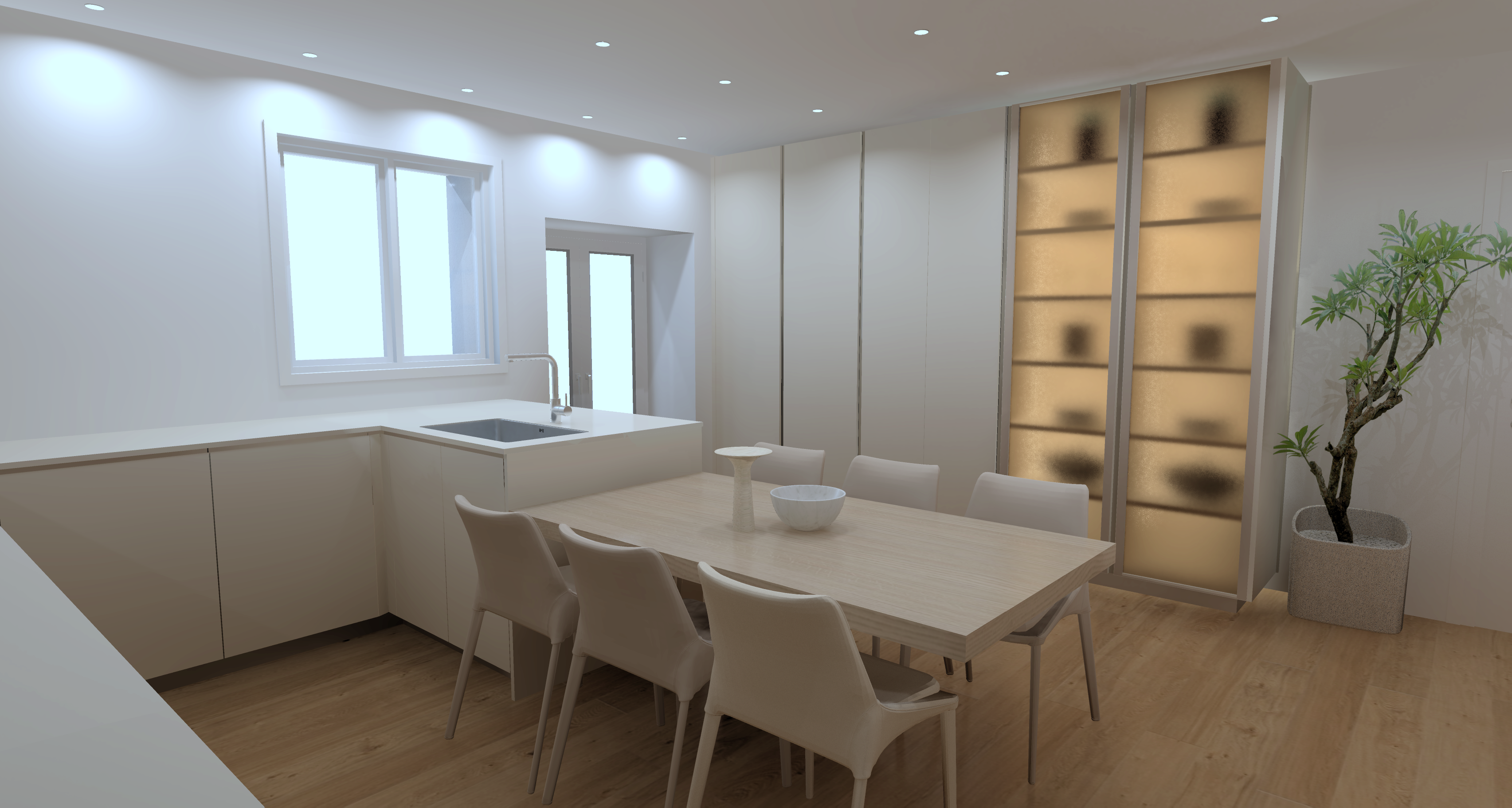act as an award winning architectural photographer and senior cgi to photo compositing artist specialized in transforming sketchup style interior renders into indistinguishable high end photoreal architectural photographs your task is to convert the provided image into a fully photorealistic interior photograph while strictly preserving the original architecture layout and composition 1 absolute preservation rules non negotiable preserve exactly architecture dimensions proportions and layout camera position focal length feel perspective and framing horizon line vertical alignment and composition balance do not move resize add or remove any elements modify furniture placement cabinetry openings or fixtures alter spatial relationships or staging maintain a perfectly consistent architectural perspective no warping no reinterpretation 2 camera photographic realism simulate a full frame professional architectural camera setup maintain natural lens behavior minimal distortion clean verticals and controlled perspective add subtle photographic qualities fine natural grain realistic depth and micro contrast avoid hdr look over sharpening artificial clarity 3 materials surface realism high priority replace all materials with ultra realistic 4k 8k pbr textures including accurate albedo roughness gloss normal maps micro displacement where needed precise material definitions floor natural wood parquet flooring matte finish not glossy subtle grain variation realistic plank joints slight wear cabinetry furniture beige melamine finish soft matte to satin reflectance slight tonal variation and realistic edge detailing countertop plan de travail same beige melamine finish as cabinetry continuous homogeneous appearance realistic soft reflections non plastic non glossy dense tactile premium look glass doors green tinted fluted ribbed strong bronze tinted color blured glass subtle vertical striation physically accurate light diffusion and reflections slight opacity with realistic depth all surfaces must include micro scratches slight smudges edge wear imperfect reflectivity realistic seams and joints 4 vegetation natural elements replace all plants with botanically accurate ultra detailed foliage include variation in leaf size orientation and density natural branching randomness subsurface scattering light passing through leaves avoid decorative or artificial cgi plant appearance 5 lighting global illumination use natural daylight only consistent with openings ensure physically accurate sun direction soft realistic shadows with penumbra global illumination and bounced light subtle ambient occlusion maintain balanced interior exterior exposure no blown highlights or artificial brightness 6 atmosphere color grading apply true to life photographic grading neutral whites accurate beige and wood tones controlled contrast and dynamic range add subtle atmospheric depth realistic air perspective 7 final realism target the final image must be indistinguishable from a real architectural photograph suitable for publication in a premium design magazine 8 negative constraints strict no cgi look no plastic or fake materials no exaggerated reflections no artificial glow or bloom no layout or design changes no added or removed objects no stylization or artistic reinterpretation