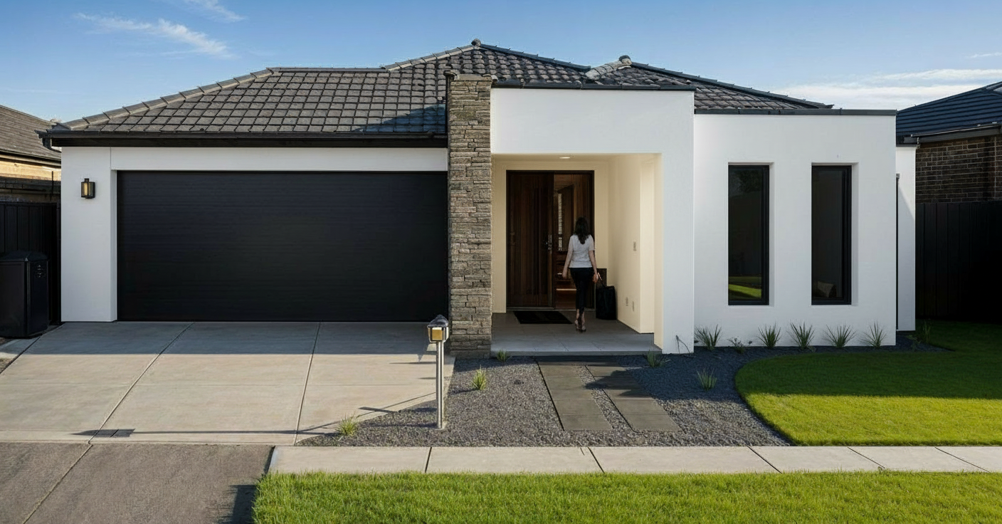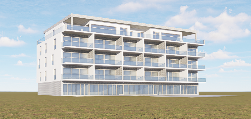 add family houses in the background in front of the apartment building there is a children s playground on the right side and a terrace for sitting