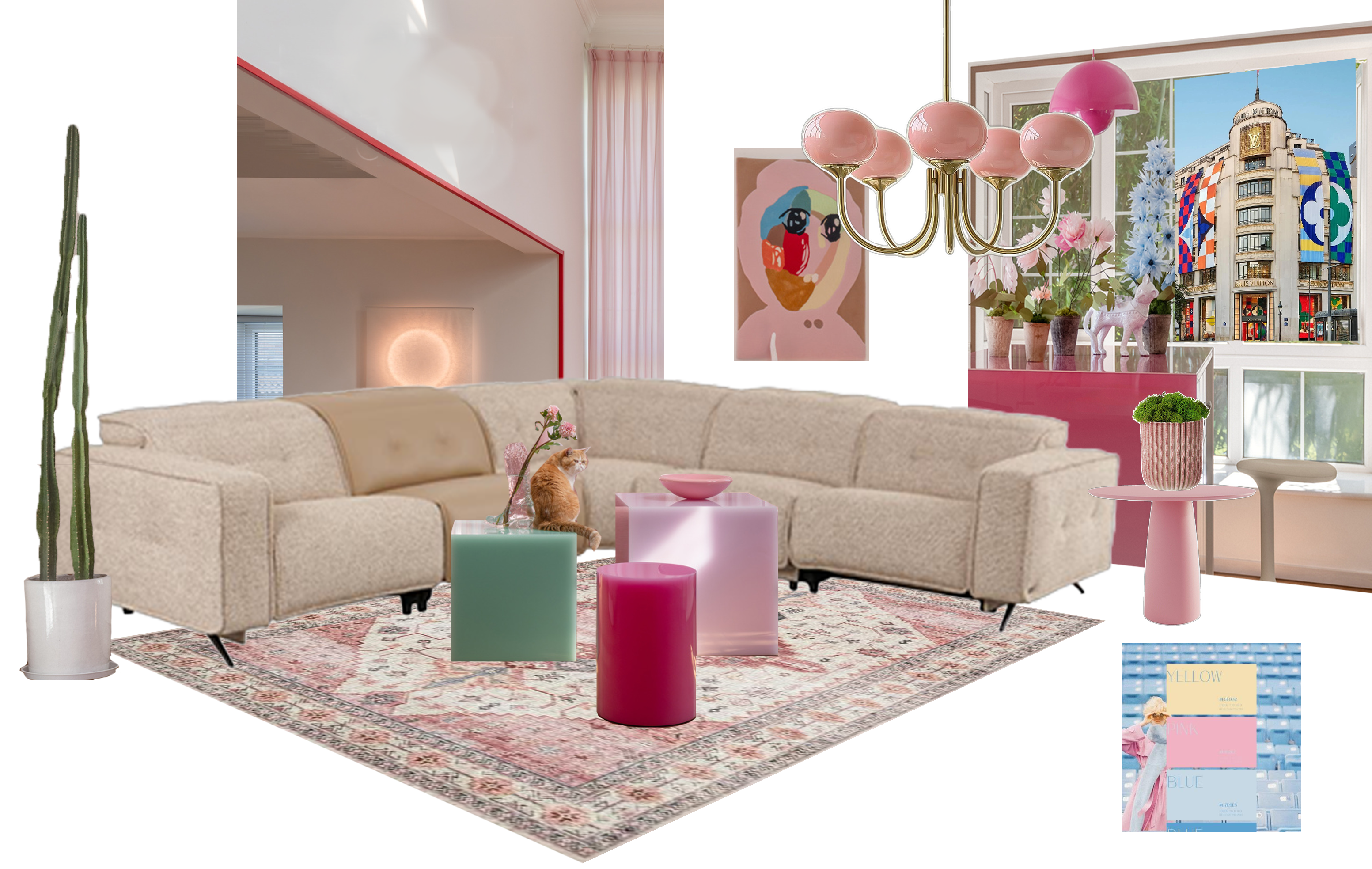 create a warm and cozy colorful spacious living room with a mid century modern aesthetic creating a soft and elegant atmosphere place a fluffy beige l shaped sofa in the center of the living room surrounded by a vintage rug in soft pink and cream add a touch of nature with a small round pink table topped with a potted green plant a bright pink cylindrical table and a translucent pink square table topped with a bowl are also included warm abstract modern art hangs on the walls and a chic pink spherical brass chandelier hangs overhead a window reveals a view of the iconic building add a touch of greenery with soft decorative elements and a tall cactus in a white pot adjust the lighting to create a warm and inviting atmosphere