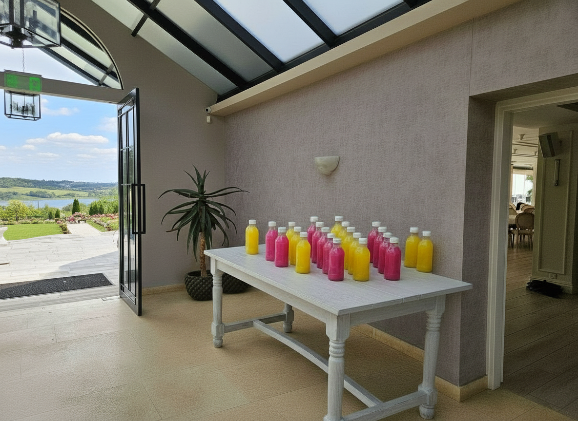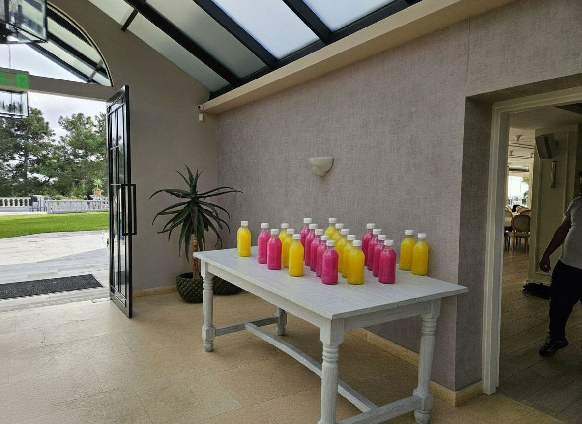 add more bottles so that they fill up the table then arrange them in rows one row with lemoade juice the other row with pomegranade juice
