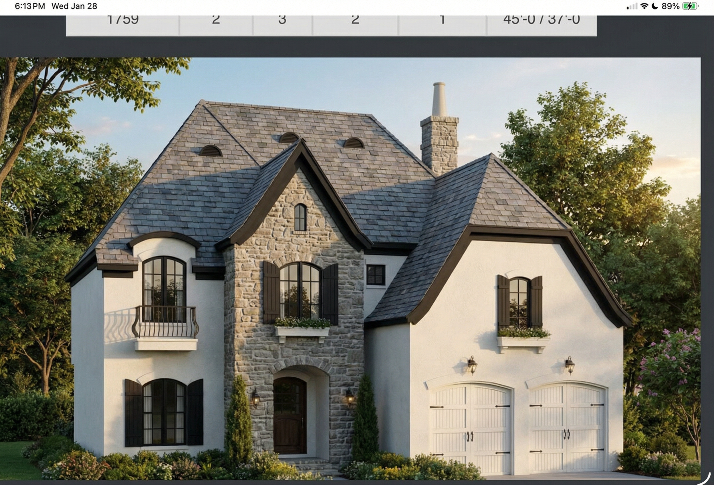 daylight white walls low stone wall forefront of building grey eaves on building no gap in forefront wall chimney stack red brick