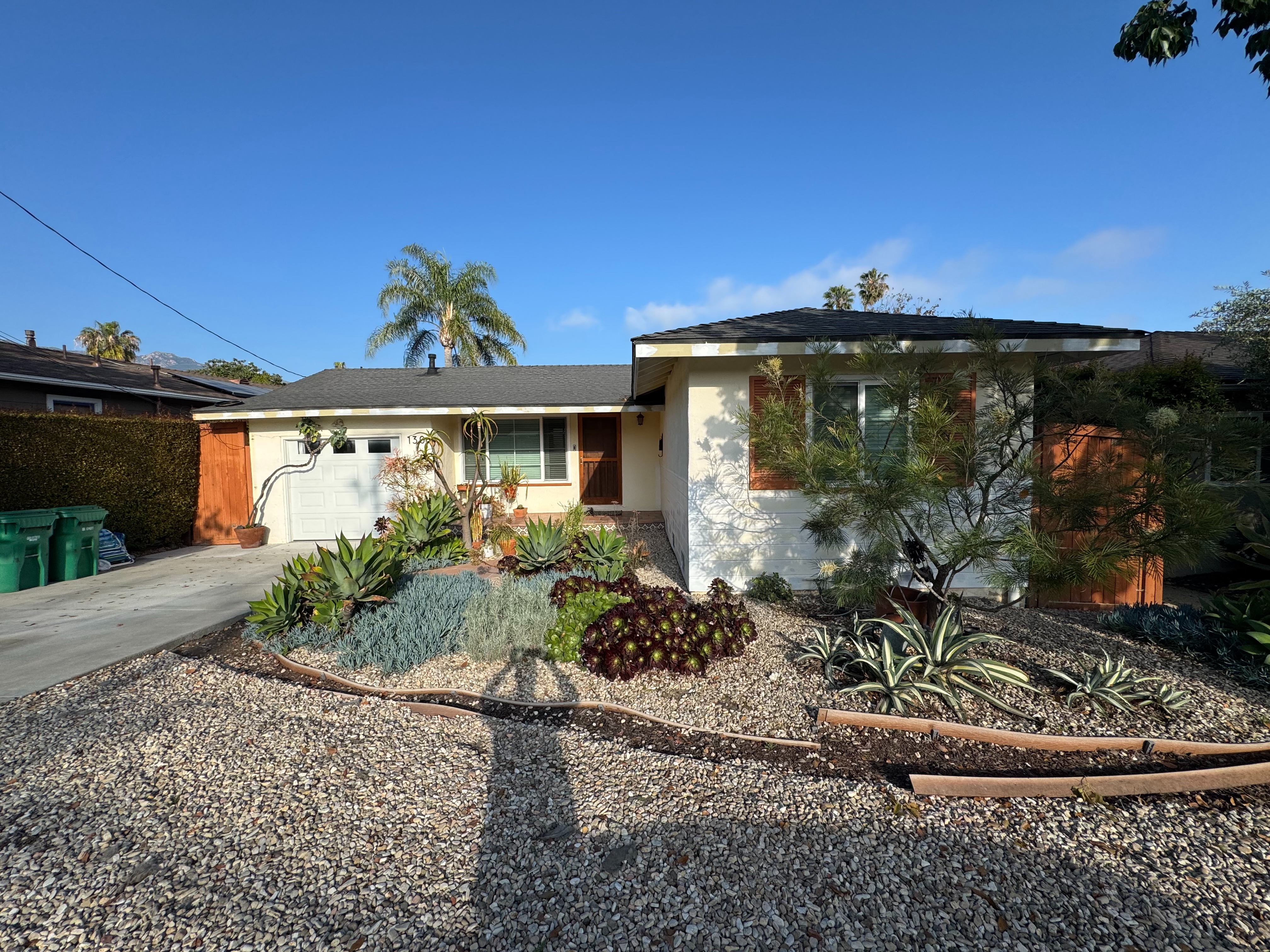 horizontal siding at the bottom to be a light sage green shutters garage door and gutters to be a warm charcoal stucco portion of house to be a warm white
