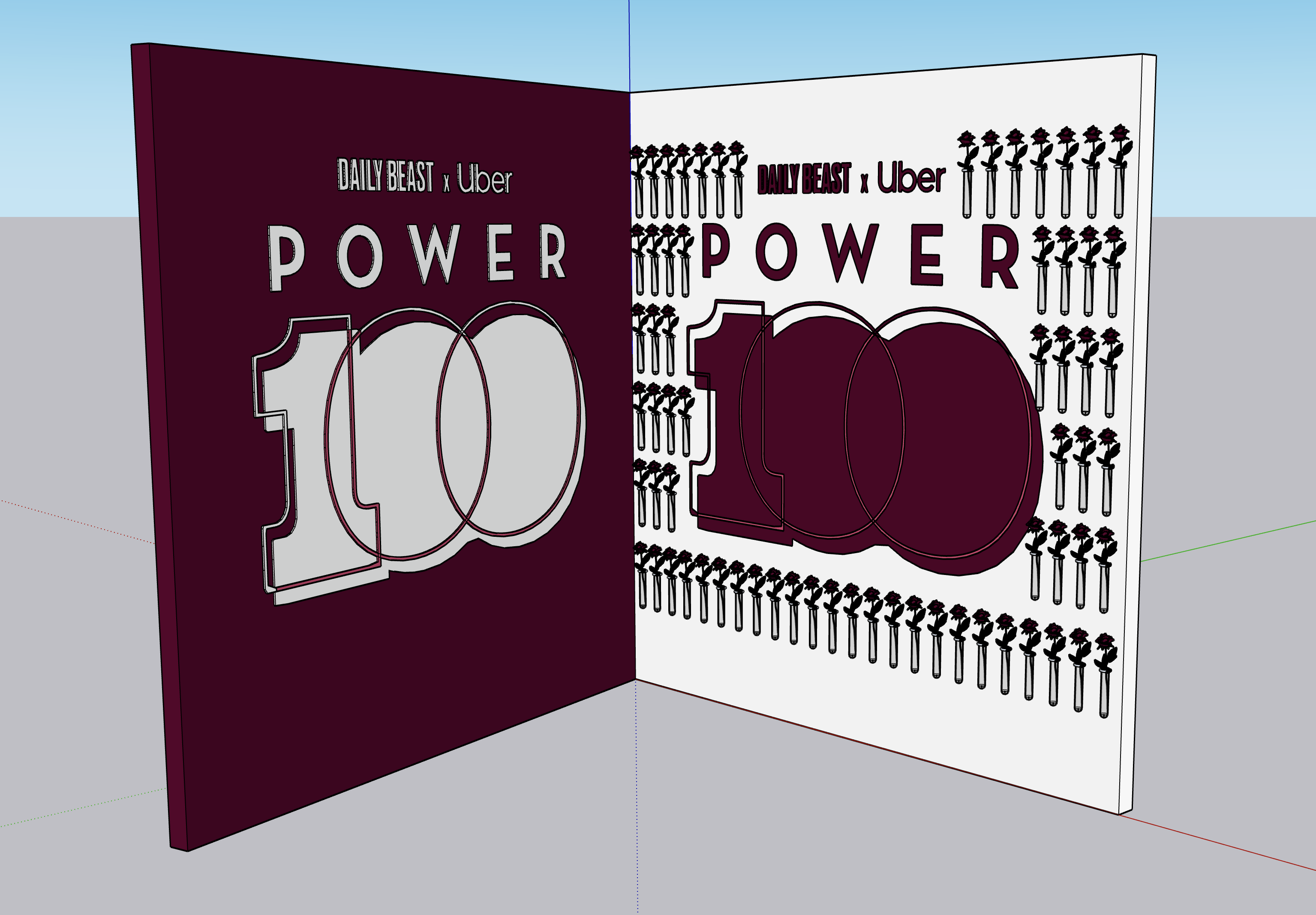 create a split screen image of two panels standing at an angle each displaying the phrase power 100 in bold text on the left panel use a deep burgundy background with white text and a large number 100 outlined in white on the right panel use a white background with the same burgundy color for the text and the 100 outlined similarly the scene is well lit with a soft and modern atmosphere capturing a professional and elegant look make the burgundy color matte acrylic put burgundy roses in test tubes