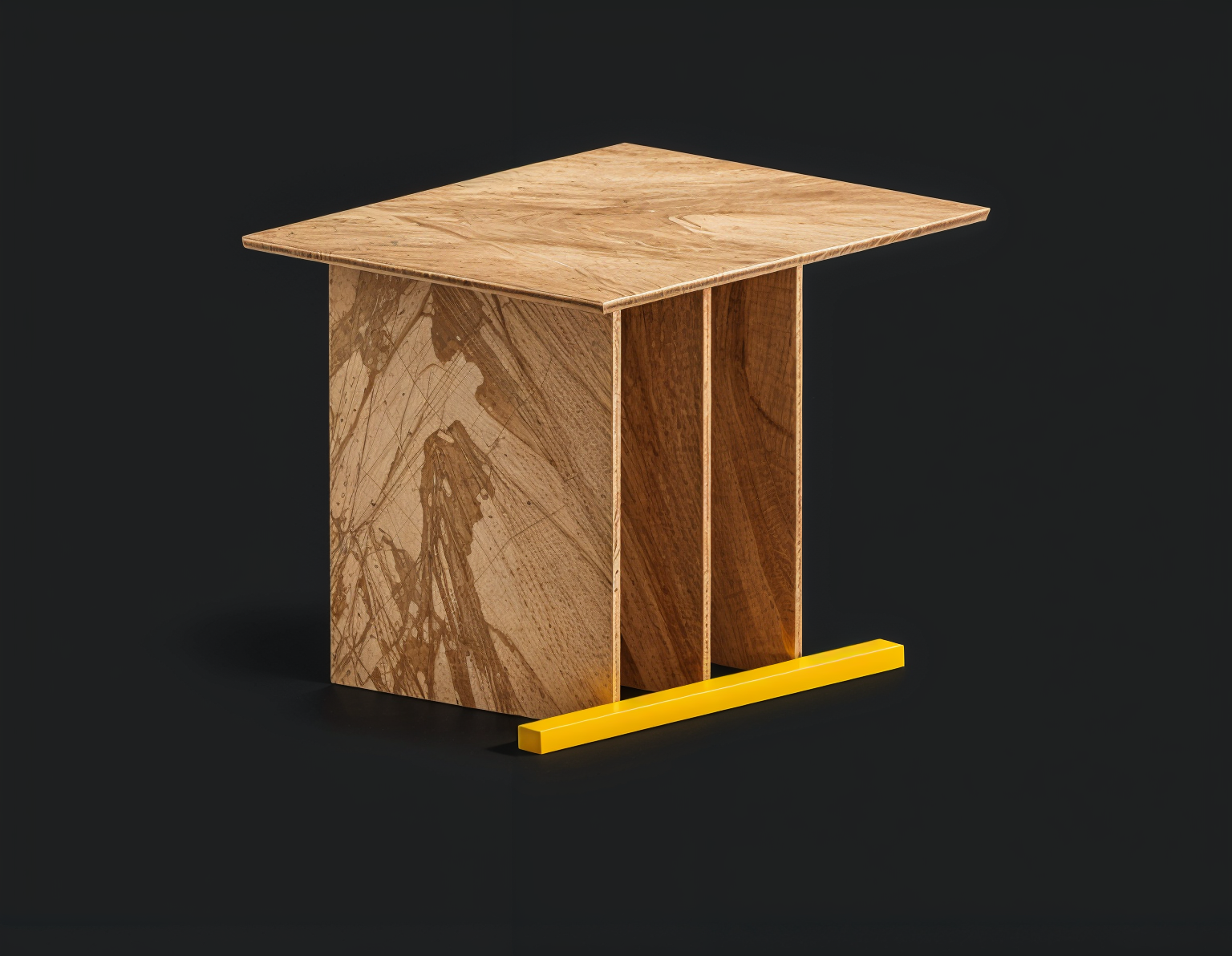render a rustic wooden table made from osb timber the bottom leg should be made from a yellow painted wood batten maintain the colors with a plane blackground architecture