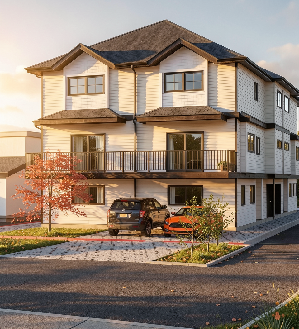 important preserve the existing geometry and the existing context exactly as provided do not modify alter reinterpret add remove scale or reshape any geometry do not change the site surroundings street layout neighboring buildings vegetation or context elements do not modify geometry scale proportions buildings road layout sidewalks or surrounding context in any way do not change text photorealistic architectural rendering clean and balanced contrast calm cinematic mood style contemporary european residential architecture minimalist premium understated delete all people and cars do not alter the church color soft overcast noon atmosphere diffused natural daylight with subtle blue grey tones cinematic architectural mood large glass surfaces with realistic reflections soft mirror effect subtle environmental reflections of sky and surroundings soft wet pavement with soft light bounce and blurred reflections high dynamic range lighting realistic global illumination soft shadows calm and minimalist nordic mood photorealistic architectural visualization balanced exposure no harsh highlights