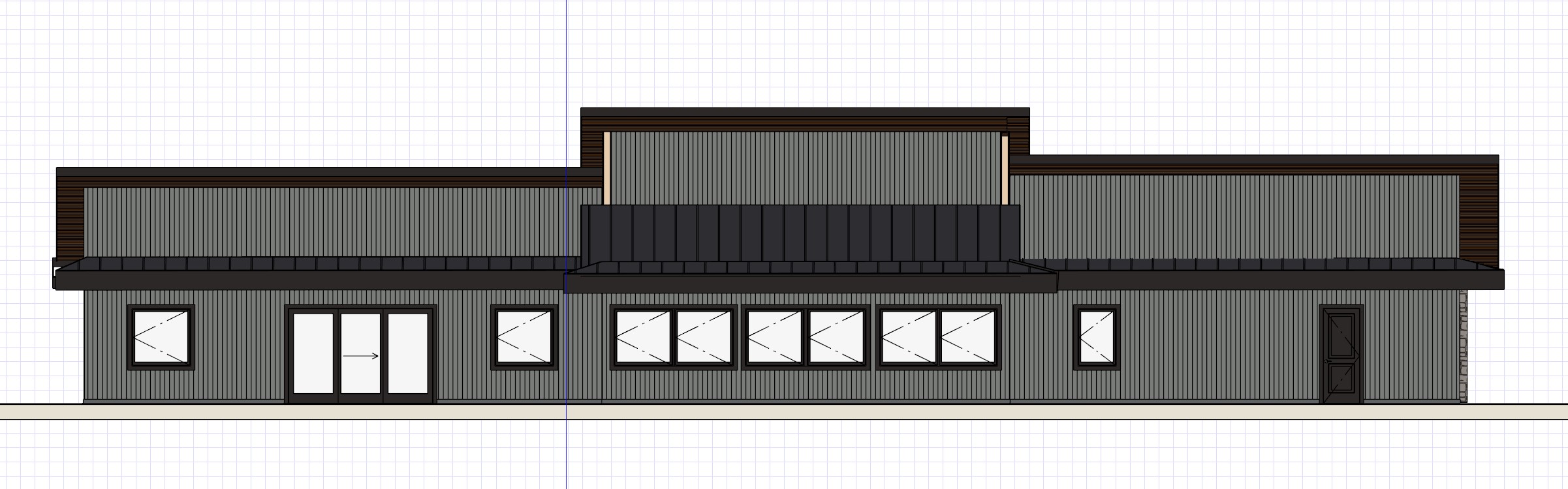 make this image a photograph the home has dark gray vertical vinyl siding the soffit would be a cedar stained plank the windows are dark brown add trees