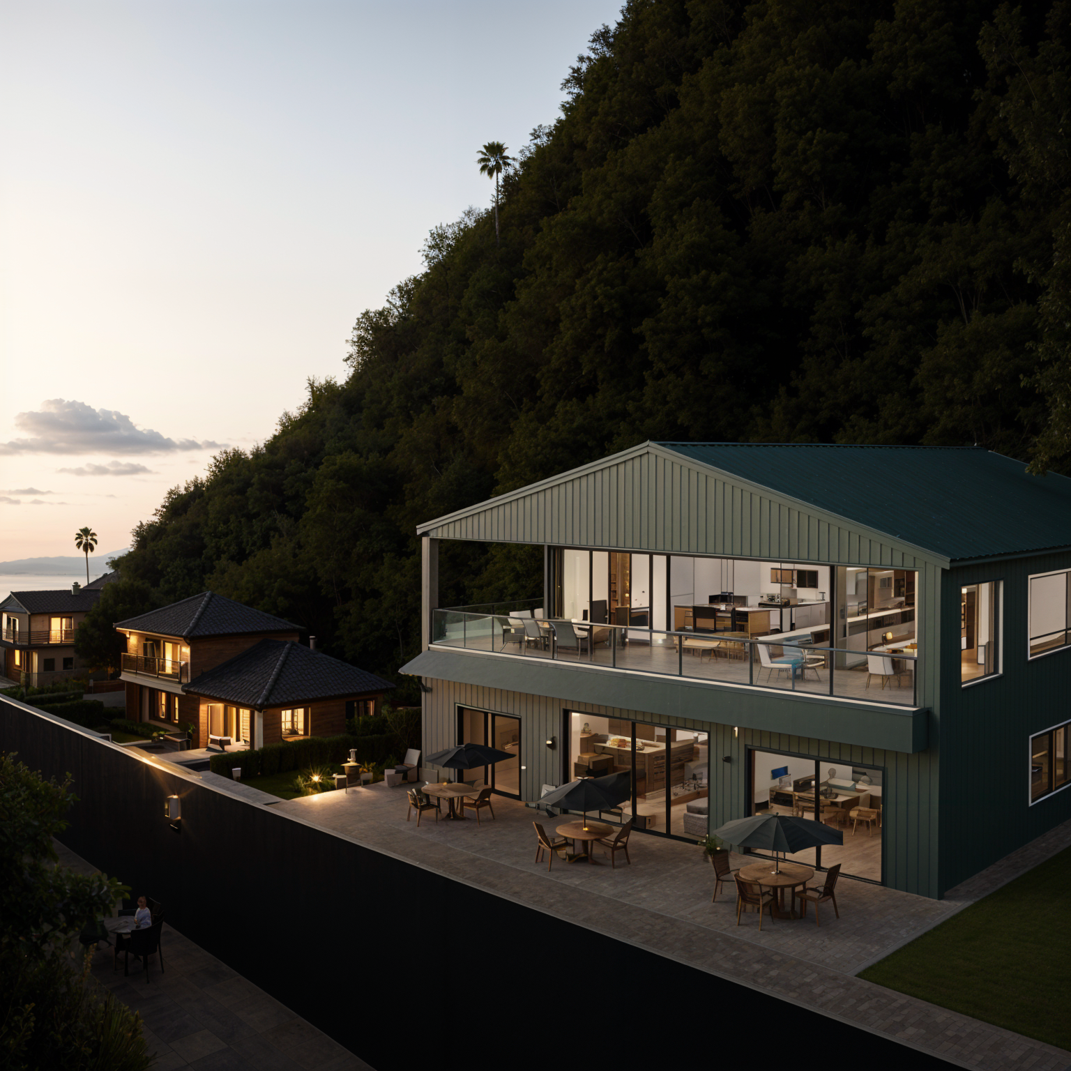 greenery and trees on the right of the building low old buildings on the left paved floor in front of the building bushes on both sides of the entrance no letters on the picture delete the written sign clouds in the sky beautiful sunny day old church behind the building on the left a road on the left of the big building classical pavement in front of the building then grass with small bushes the fascade should be creamy white
