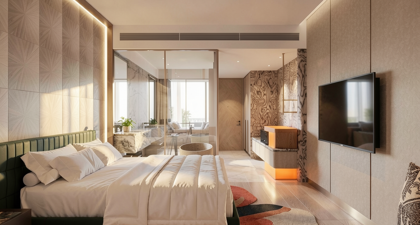 transform the uploaded white model of the atrium into a grand cinematic neoclassical interior staged as a luxury installation by anish kapoor preserve all geometry exactly as modeled emphasize verticality light and immersive sculptural drama architecture finishes walls columns balustrades warm ivory stone with extremely fine almost imperceptible texture smooth sculptural and elegant windows deep black lacquer panes with minimalistic frames made of burgundy marble with microscopic veining subtle tactile luxurious visually tying the window to the sculptural theme metallic elements aged brass trims railings and fixtures catching soft directional highlights floors and terraces pale honed stone slightly reflective grounding sculptural forms burgundy sculptural installation kapoor style multiple large fluid and monumental burgundy forms suspended from balconies positioned on terraces or rising from floors organic curves voids and bulbous shapes interact dynamically with light and architecture surfaces semi gloss or reflective catching candlelight ambient light and reflections from glass ceiling forms integrate naturally with atrium height and verticality creating immersive visual rhythm minimal additional objects the sculptural burgundy forms themselves act as the artistic narrative decorative details integration window frames and small architectural elements subtly echo burgundy tones in the veined marble tying the installation to the building without competing with the monumental forms sculptural forms can interact with terraces niches and balustrades emphasizing the space s volume and perspective lighting atmosphere dramatic caravaggio inspired chiaroscuro deep shadows strong directional highlights sculpting architecture and sculptural forms hidden uplights and candlelight accentuate curves reflections and verticality volumetric haze enhances depth painterly quality and cinematic luxury light interacts dynamically with burgundy surfaces and marble frames creating subtle glints highlights and painterly reflections glass roof reflections emphasize transparency reflections and deep indigo twilight reflections on black lacquer panes brass and burgundy forms create painterly shimmer and visual depth camera composition eye level or slightly upward perspective to capture full height verticality and sculptural drama cinematic 50mm full frame equivalent lens composition symmetrical but alive through sculptural burgundy forms marble accents and dynamic light contrast color palette warm ivory pale stone walls aged brass metallics deep black lacquer windows burgundy sculptural forms and veined marble window frames deep rich luxurious candle gold highlights deep indigo twilight visible through glass ceiling mood storytelling luxurious immersive dramatic and mysterious burgundies as monumental sculptural installations interacting with architecture to transform the atrium into a cinematic art experience scene evokes a high design european hotel installation frozen like a painterly cinematic moment