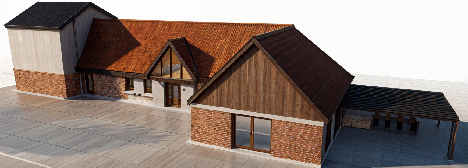 add low level grass and basic landscaping front driveway also for the yellow brickwork use wienerberger st ives cream rustica and for the red brickwork use audley antiques the rooftiles should be clay plain tiles