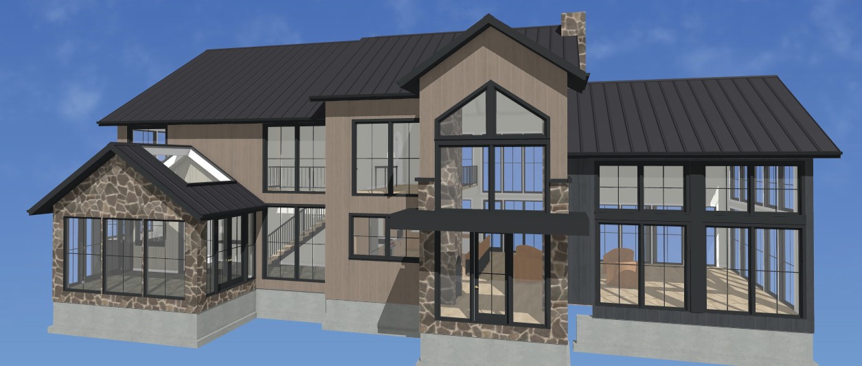 rendering shows a contemporary mountain house exterior features a mix of aged natural board and batten stone facades with a mixture of brown and gray tones and black siding the house has many large black windows a black standing seam roof and black fascia and soffit the background of the image is a wooded backyard rendering is 8k and hyperrealistic