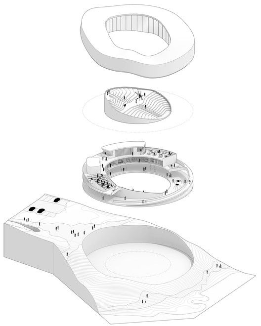 exterior shot render this as an architectural render pavilion with a concept of a nature woody material