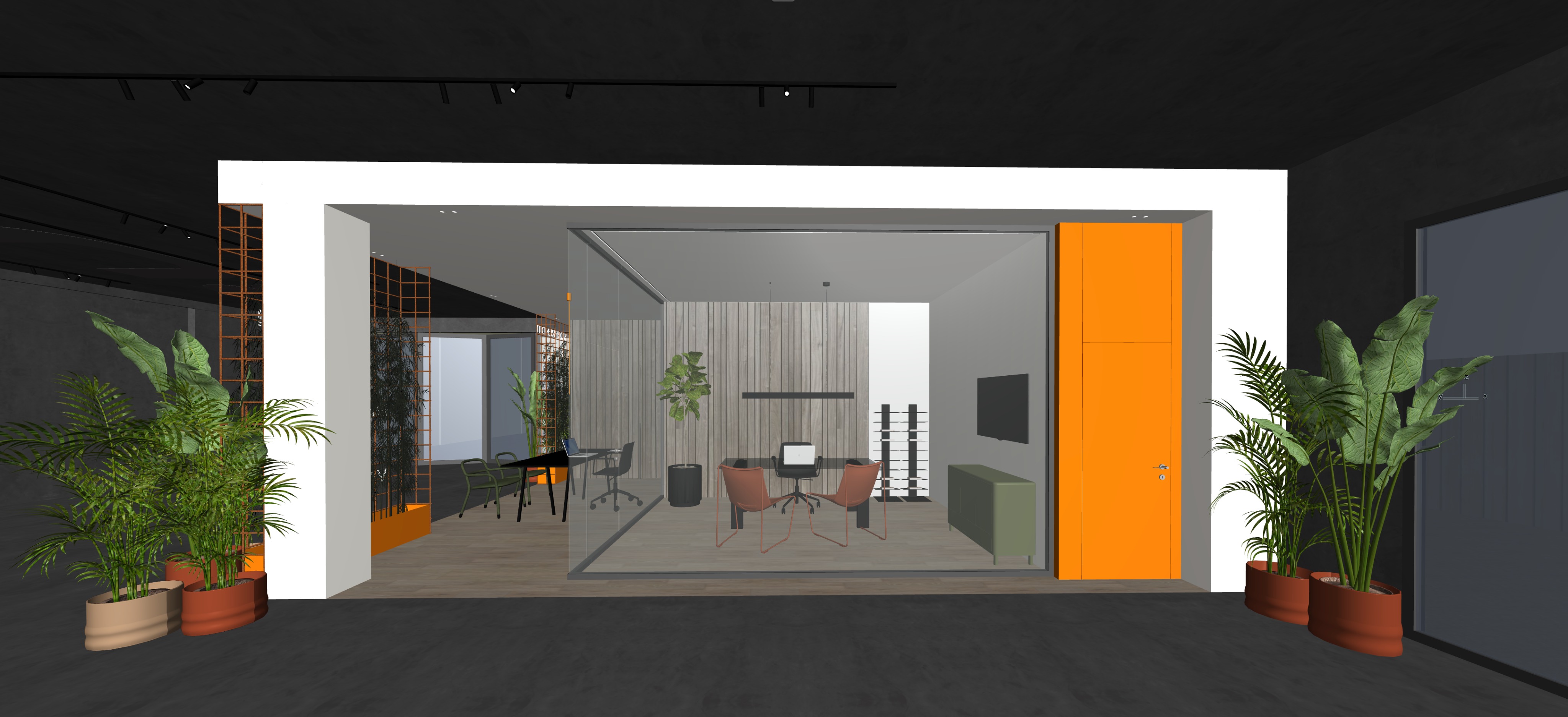 illumina la scena in modo diurno mantieni texture e oggetti invariati parquet a terra nella parte degli uffici come da immagine colora la parte ribassata ed i relativi pilastri in bianco mantieni il resto del pavimento e del soffitto invariato grigio scuro accendi luci strip led verticale alla fine della boiserie che spara verso l angolo del muro grigio scuro accendi tv