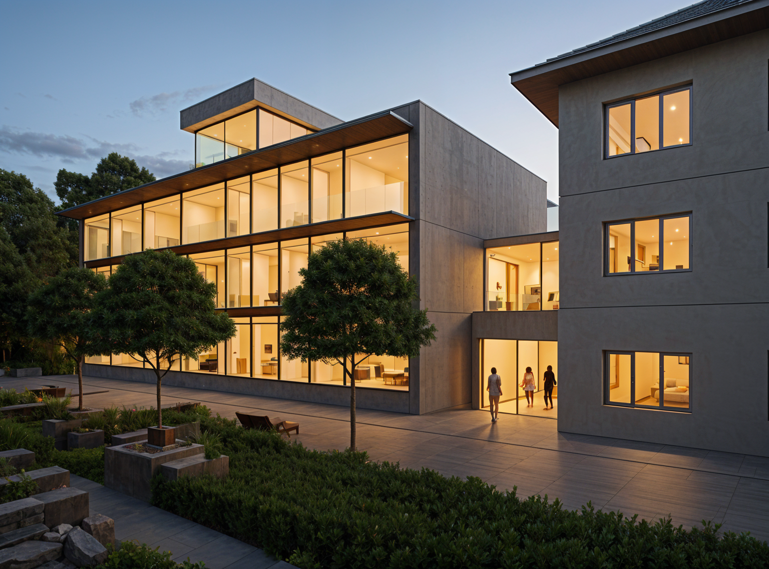 modernist exterior shot coworking space render view from above visually looking like luminon 3d effect tailor made sofas and desks around the wall perimeter very modern stylish architecture