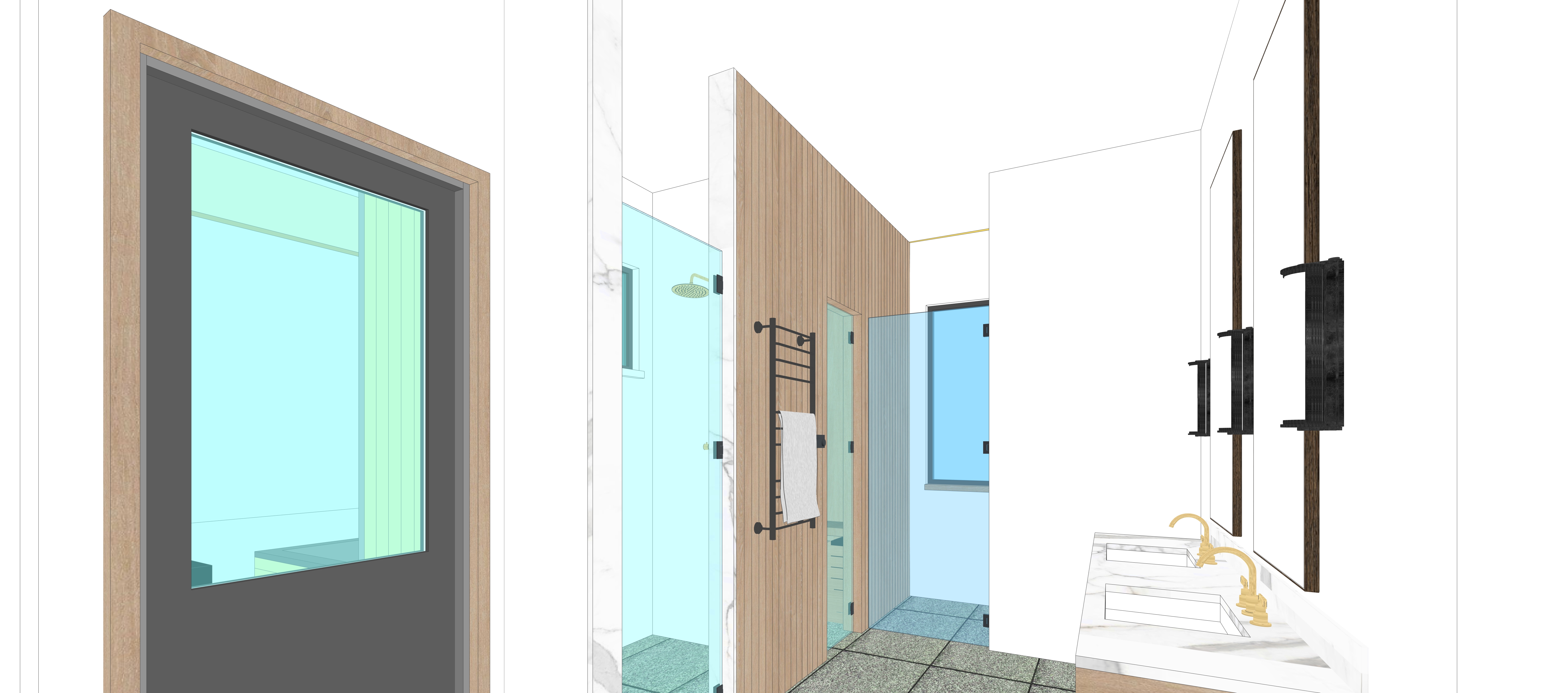 interior view of a modern bathroom oak clad wall grey stone floors oak cabinets with marble top white clay fired tile in the shower you can see a little of the hot tub out of the door with views of the 6 acres the house is on and mountain range in the far distance can lights in the ceiling