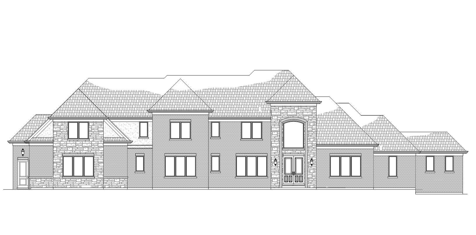 a front elevation view of an elegant residential building with light beige brick with gray shake shingles on the roof there is light grey stone at the front entrance and on the left side of the home there is some light beige stucco in the upper left side of the home set at sunset with clouds in the sky the interior should have glowing white lighting the window frames should be beige with no grills the landscape should show large trees in the background a few small bushes and flowers in the foreground do not change the angle of view