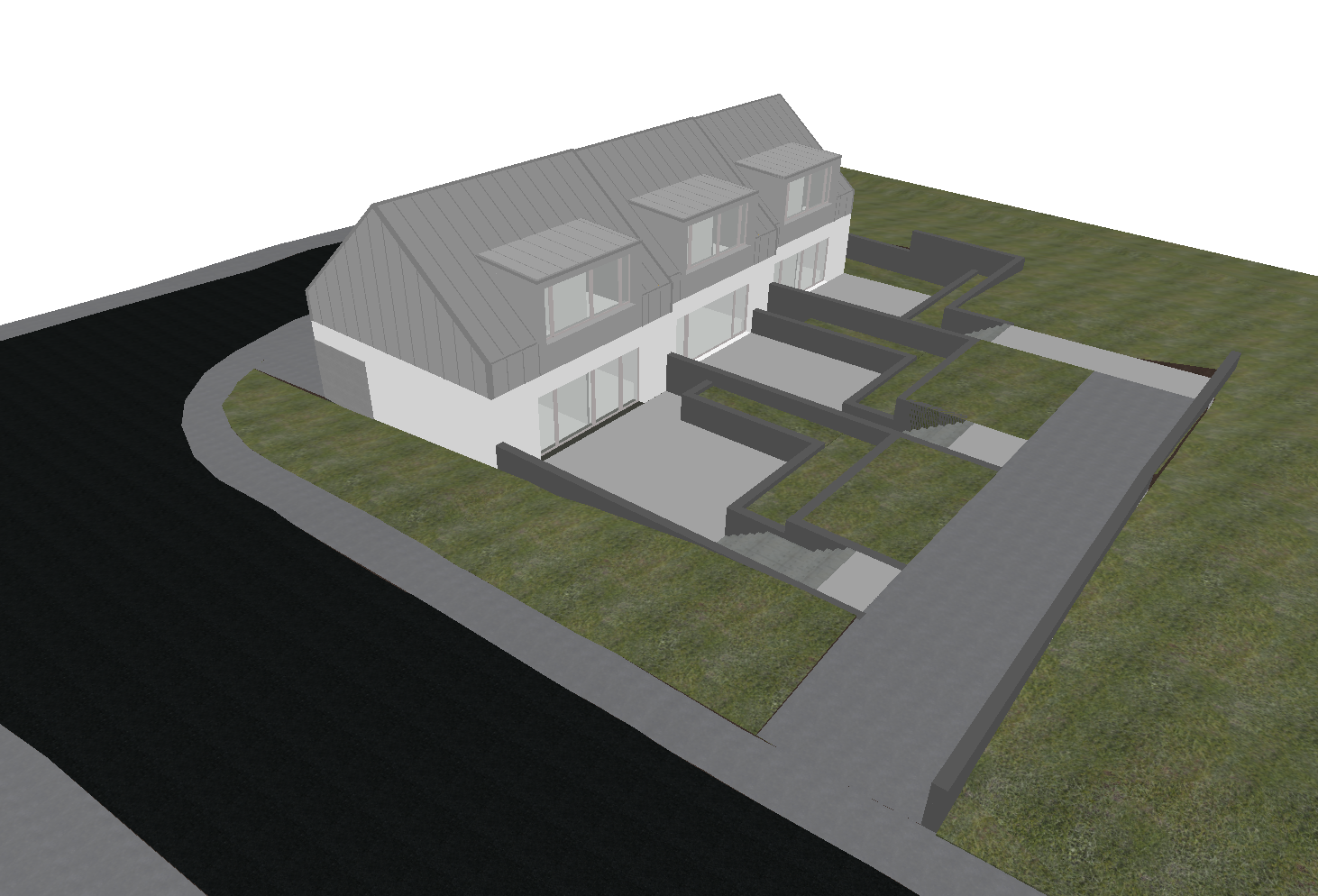 exterior shot transform this architectural model image into a realistic render while strictly preserving the existing building geometry layout and materials do not alter the shape proportions or fa ade design of the houses enhance the scene by designing the backyard garden areas