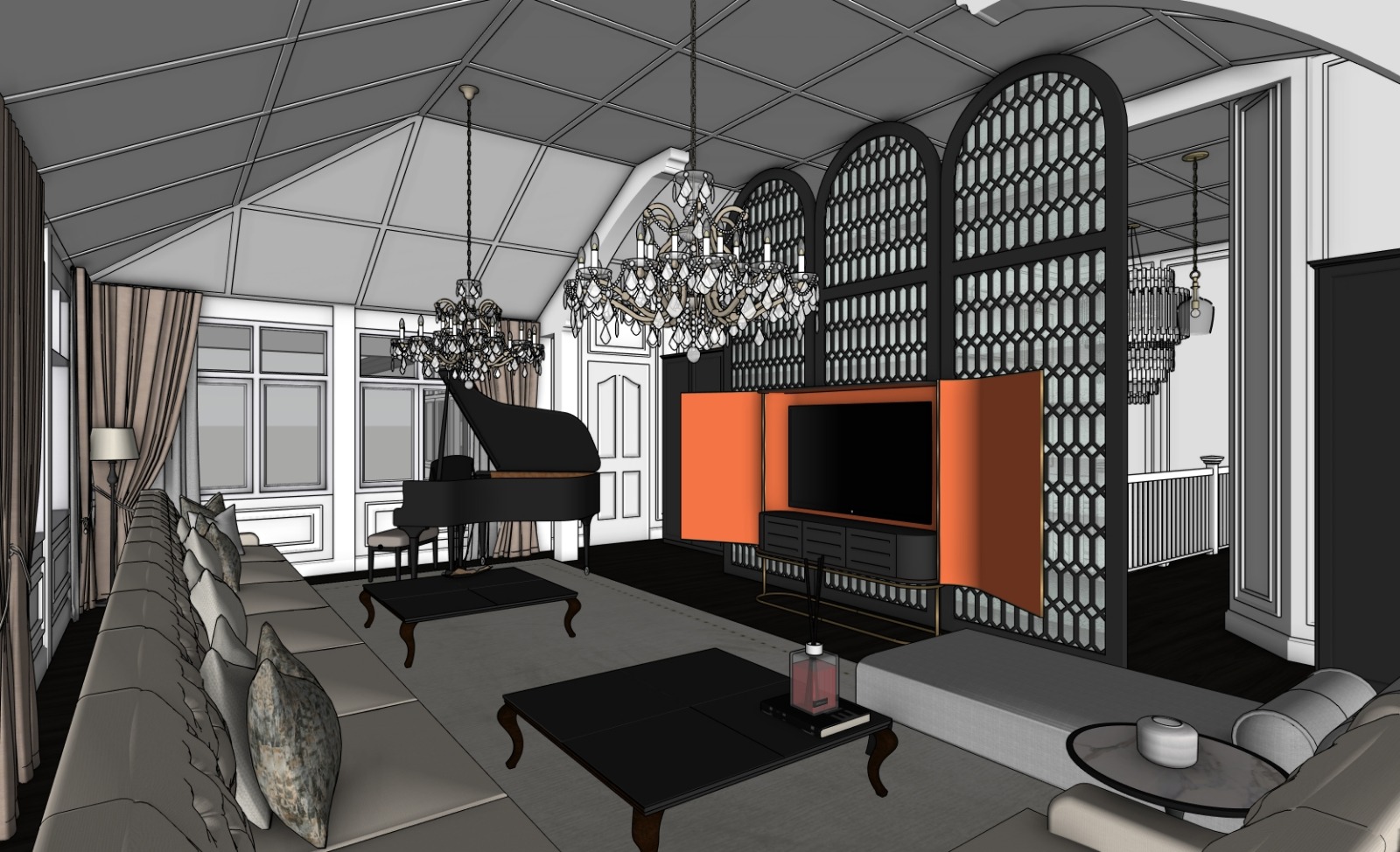 all walls widows ceiling and doors in white floor in dark wood stain frame of screen partition in matt black carpet on the floor in light beige