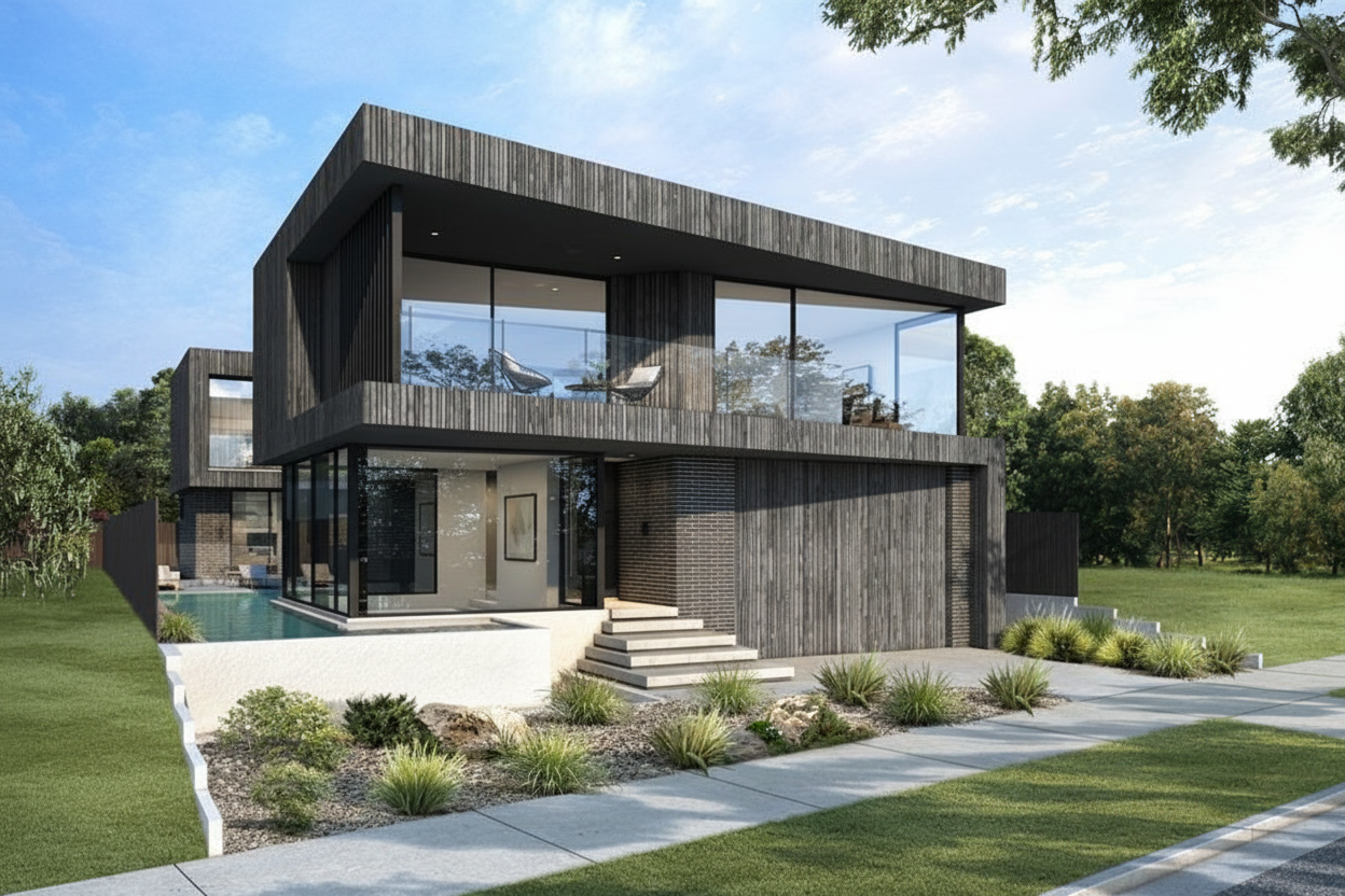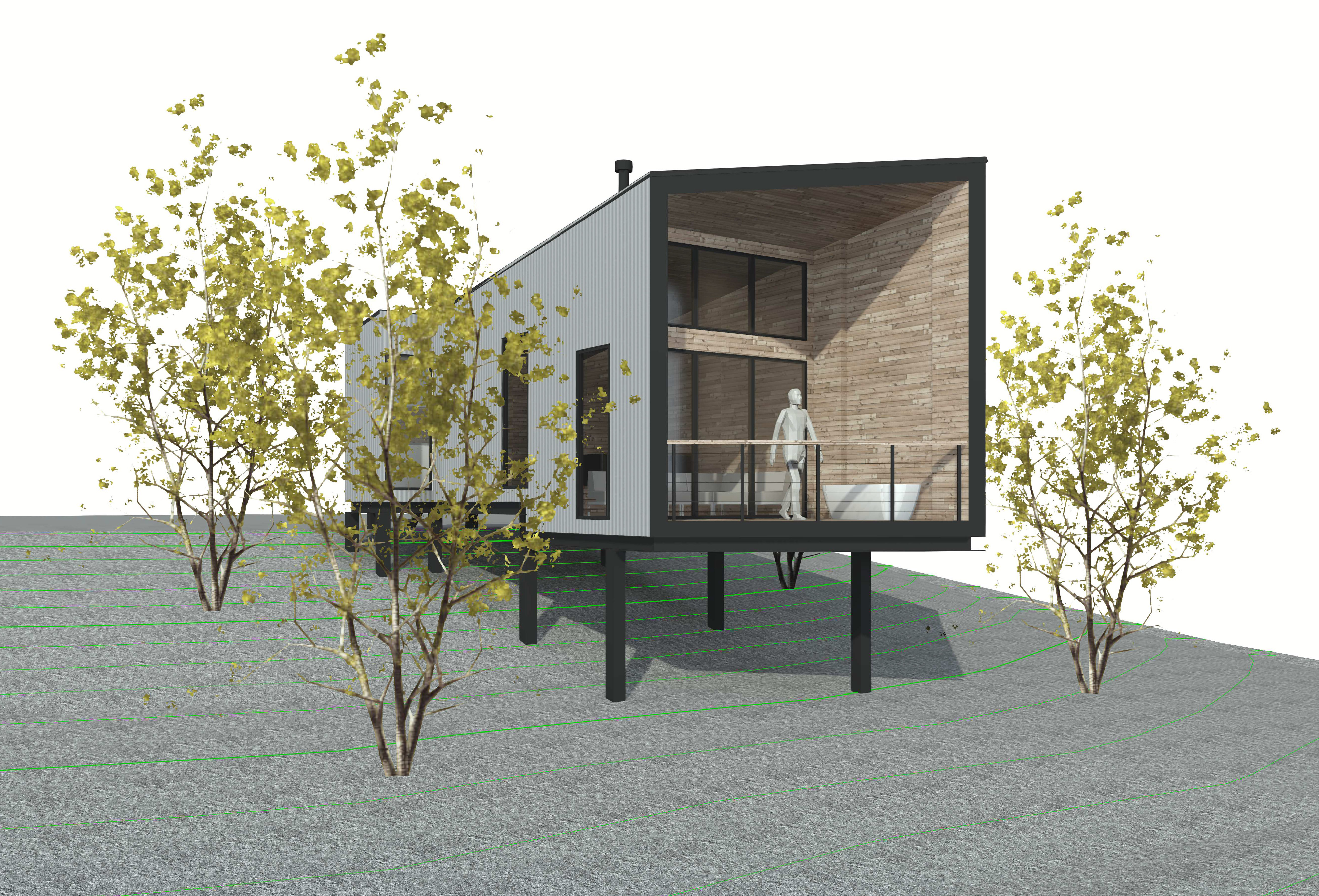 wilderness cabin cantilevering from sloping site external reflective galvanized steel cladding timber inset cladding and large black framed windows reflecting surrounding bushland patchy grass and dirt bushland ground cover with large australian gum trees behind and smaller foreground gum trees to the sides party cloudy sky with morning sunlight warming the scene