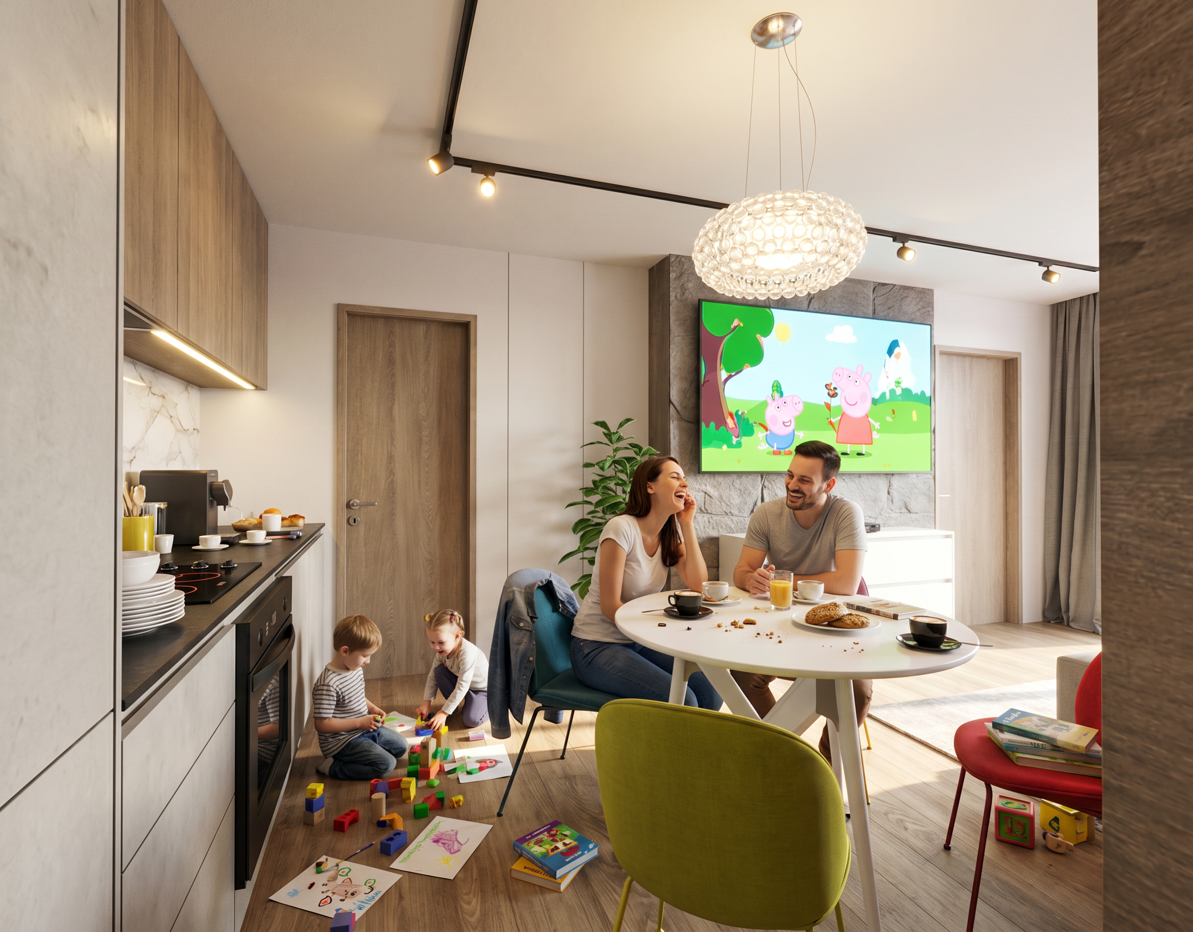 enhance this interior architectural rendering to a highly professional photorealistic level while strictly preserving the original perspective camera angle and composition do not modify the geometry layout or viewpoint in any way improve materials textures and lighting to achieve a realistic and convincing result the interior should be filled with bright natural light creating a warm friendly and inviting atmosphere ensure soft shadows accurate reflections and balanced exposure throughout the space include one or two people if appropriate to enhance realism they should appear natural subtly integrated and not distract from the architecture ensure that a bright pleasant sky is visible in the background through windows or openings reinforcing a positive and welcoming overall mood focus on fine details realistic surface qualities and refined color grading the final image should resemble a high end architectural visualization suitable for professional presentation