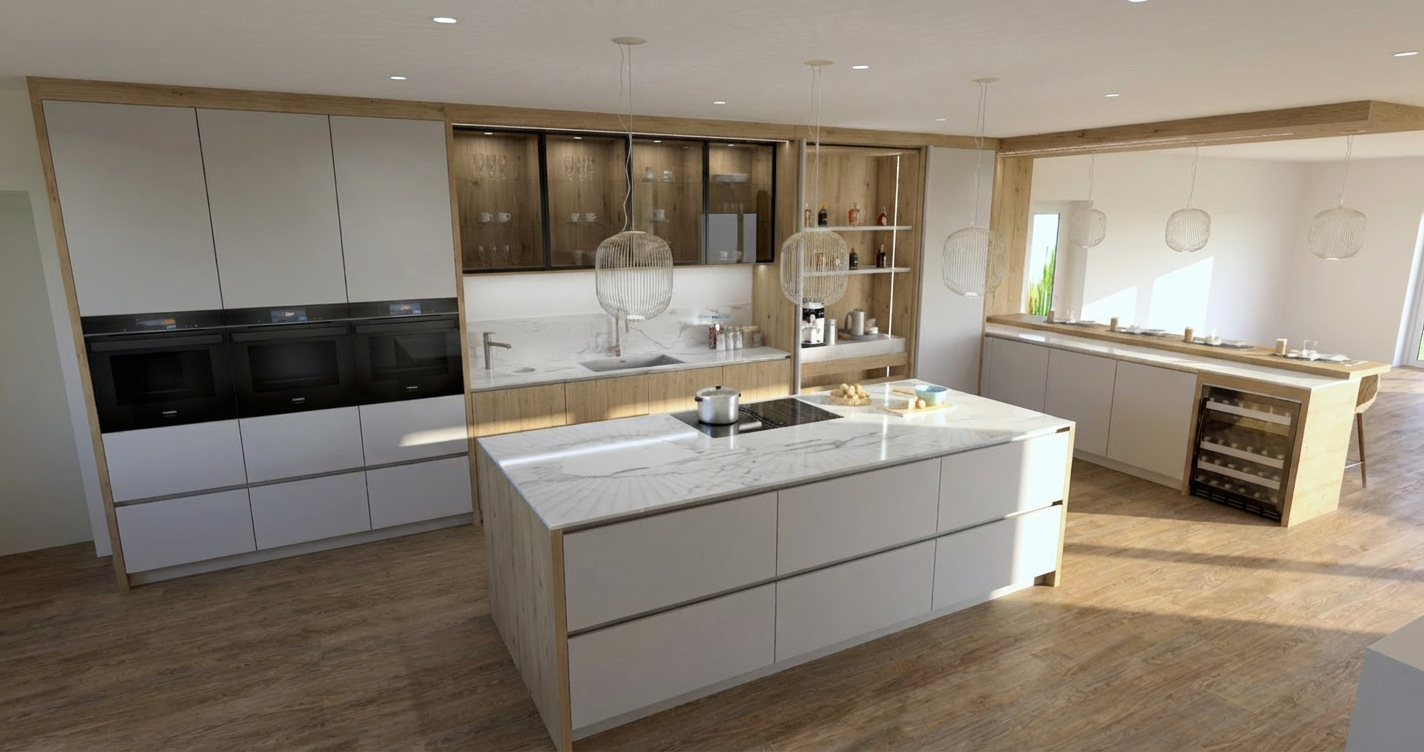 do not change the design layout camera angle or material proposal maintain all original materials and finishes exactly as provided do not add shelves on the right hand side enhance the right hand side space to feel more refined and realistic through lighting only brighten the overall space to improve balance clarity and realism ensure the left side of the space is brighter and well lit adjust the timber finish so it does not appear too dark refine the timber to a light grey brown warm tone while keeping the original timber texture and material unchanged enhance the area under the curtain on the right hand side with a clean elegant lighting effect keep the curtain plain white and enhance the curtain cove lighting so it is properly illuminated and visually pleasing enhance realism through accurate lighting shadows and material rendering only produce a clean professional photorealistic architectural render