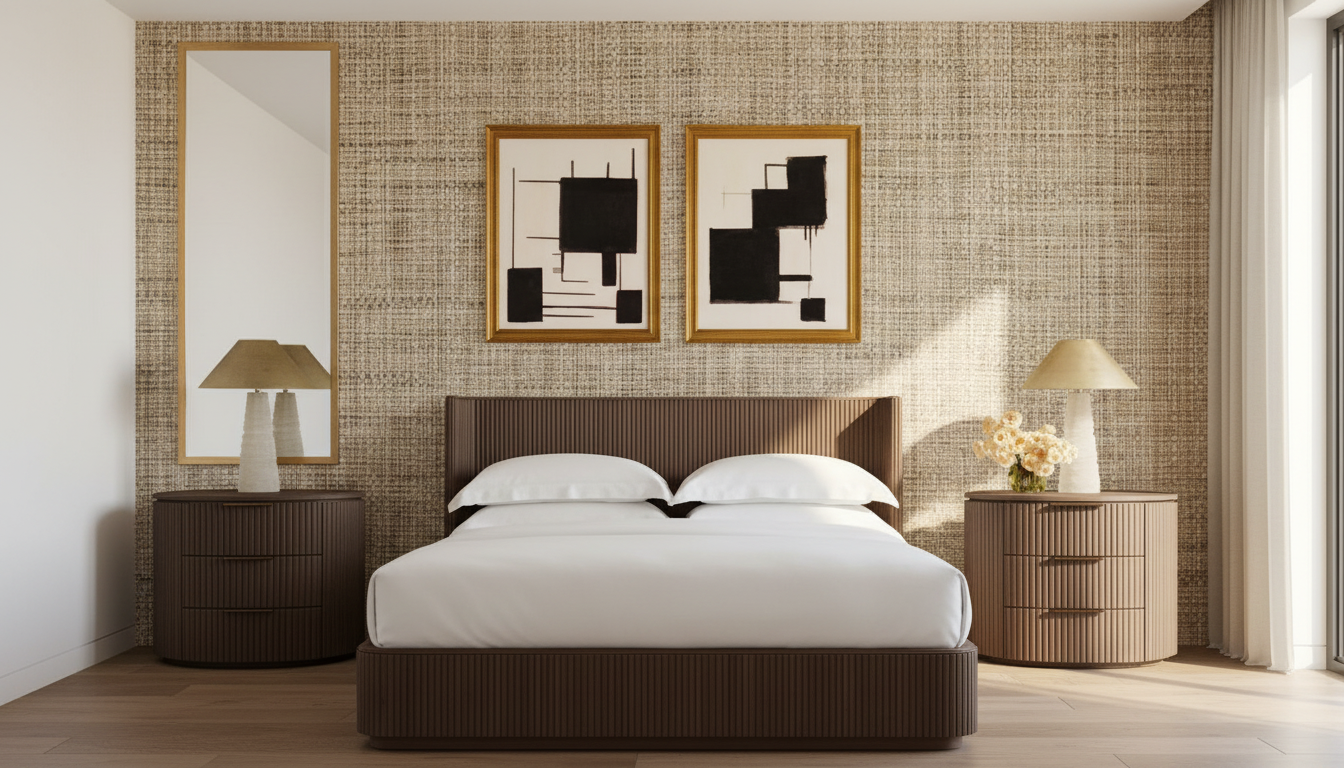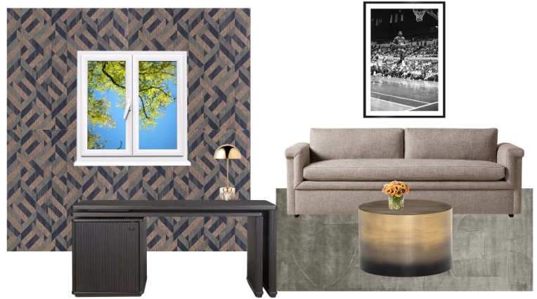 create a masculine office space with a textured wood wallpaper back drop and black l shaped desk in front off to the side add a modern seating area with sofa and coffee table and green rug with michael jordan art above sofa
