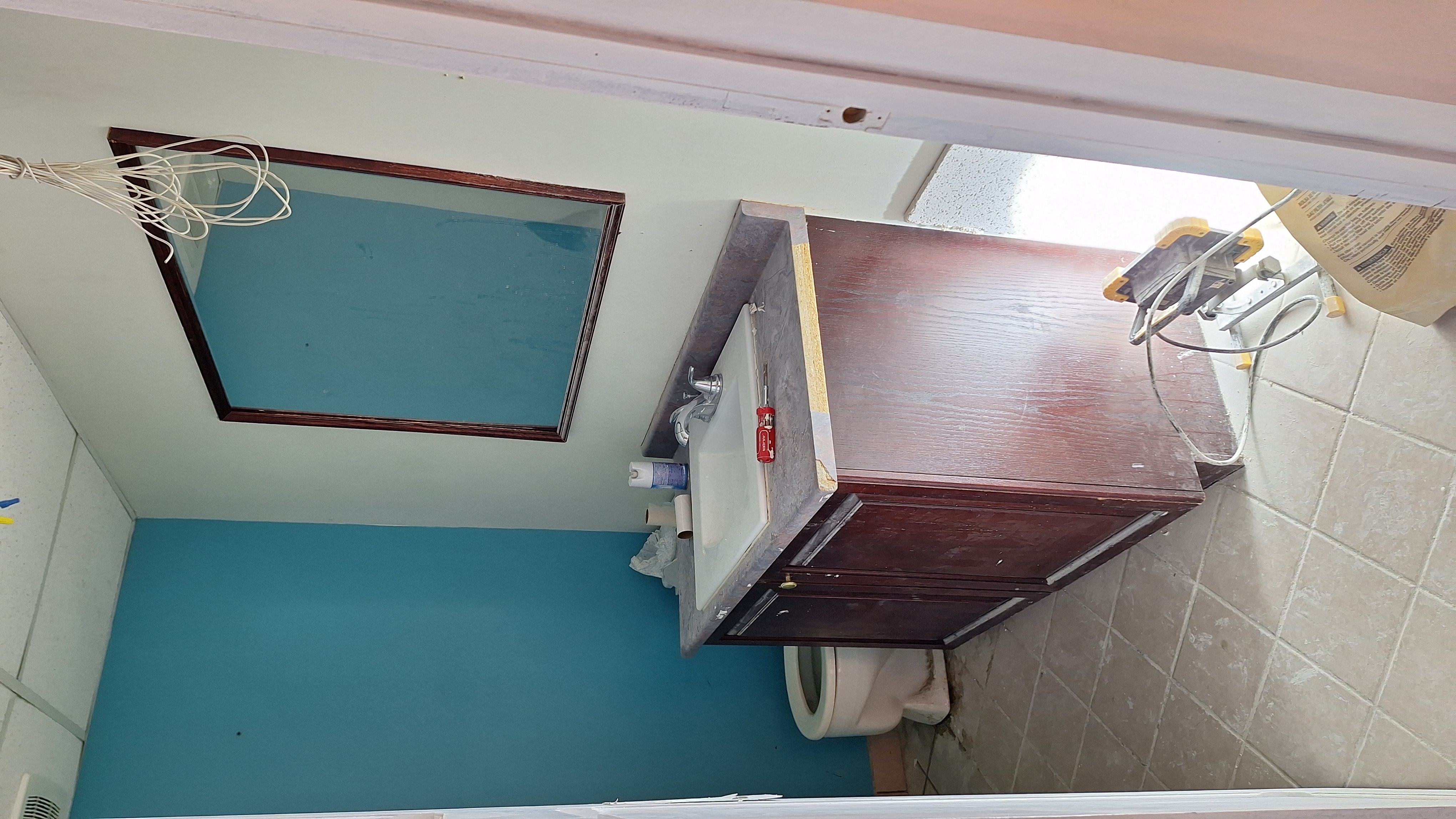 make this a modern bathroom vanity hanging and wallnut color the tiles are dark greyband the wall behind the vanity is marble looking