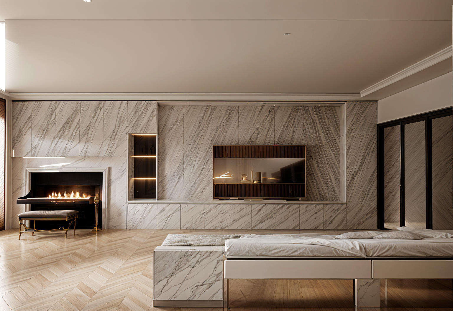 add concrete wall add wood floor add 2 nightstands made from stainless steel and dark glass top add 2 pillows add cover bed and decorative sheet on bed add 2 geometric light stands