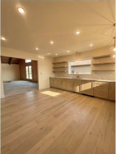 do not change anything else but the following change the view out the kitchen window to be a field and distant mountains