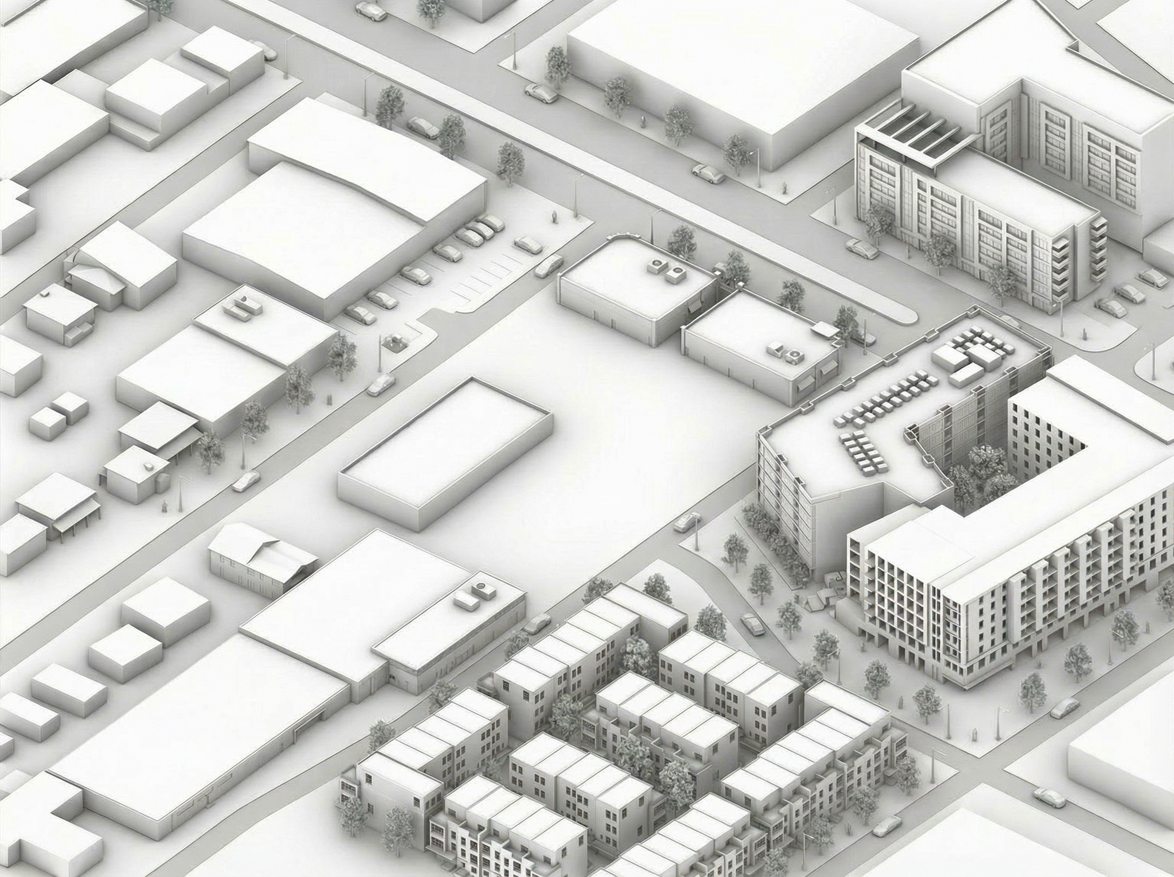 make only the following very small adjustments 1 remove a small number of trees within the central townhome block keep only a light sparse amount of vegetation so the interior does not look dense 2 add 3 4 additional clay model trees along the top main road where gaps exist spaced irregularly so they do not appear in a perfect row 3 brighten the overall clay tone slightly increase global brightness while keeping ambient occlusion light and crisp avoid adding contrast texture or darker shading do not change or add any roads buildings sidewalks hvac cars or geometry do not add trees to the central blank site do not alter any other areas of the model only make the three adjustments listed above