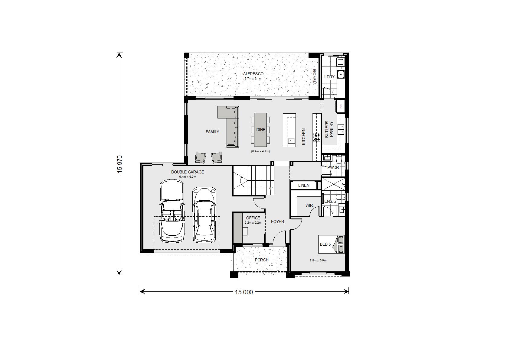 convert this floor plan into a realistic isometric 3d view of a full house show the space from an elevated angle with furniture walls and details visible modern colour scheme keep the windows and doors location and type use the same furniture as shows on the plan do not change the orientation of the floorplan