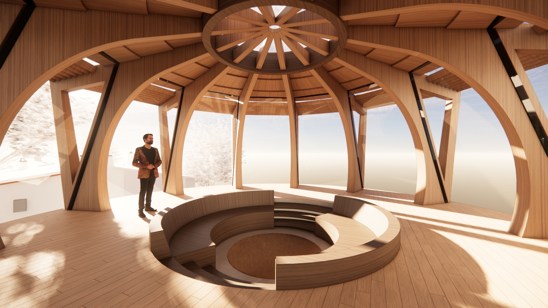 enhance this image without changing the architecture add enhance the wood ceiling detailing to add a ribbed wood veiling treatment in between the structural members