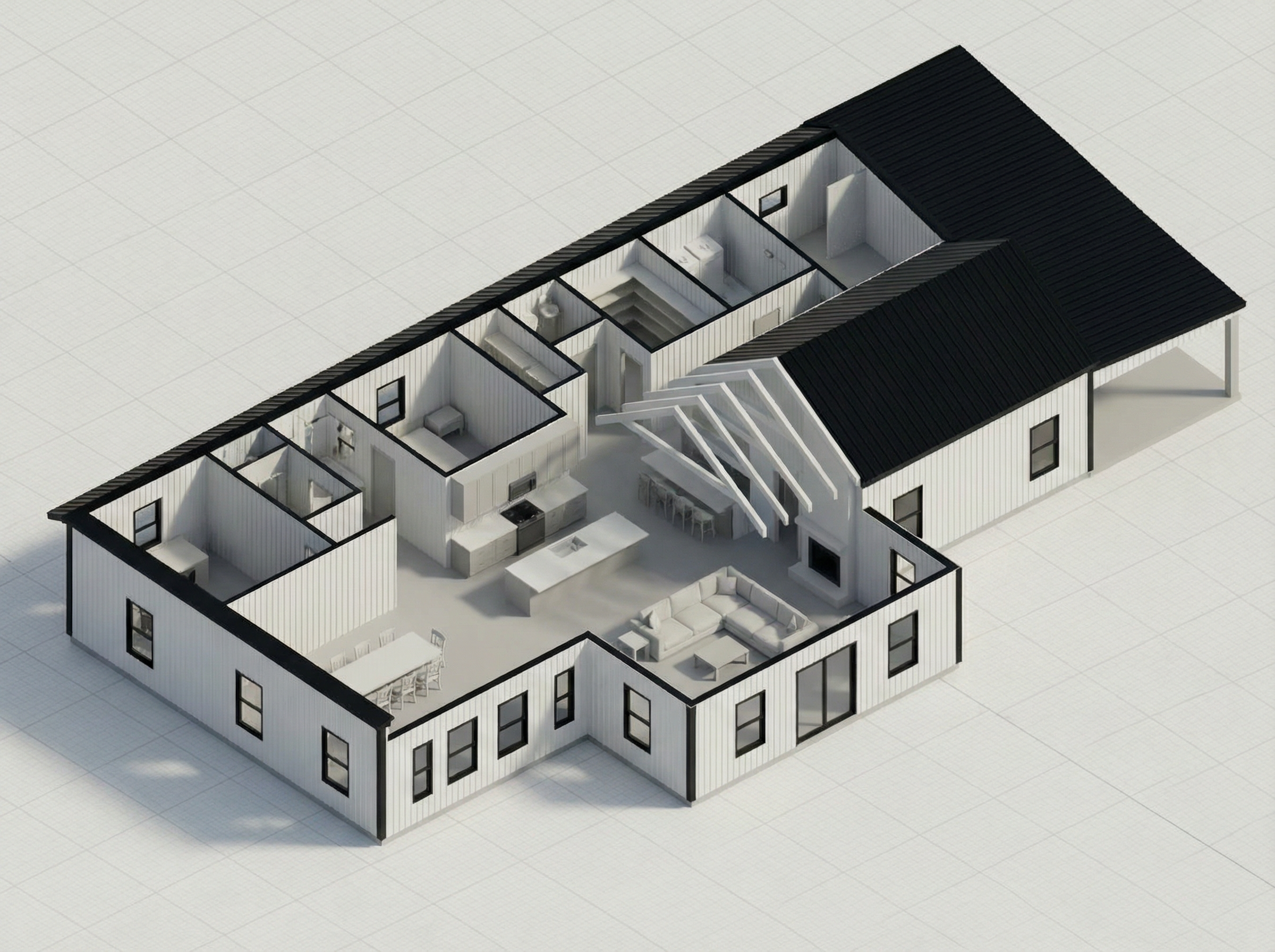 render a beautiful two story suburban house with a realistic and inviting atmosphere the exterior is painted in a warm light gray with white trim the roof features dark gray slate shingles large double hung windows have white frames and are adorned with elegant black shutters a welcoming covered porch with white columns and a black door complements the facade the small front garden is lush with greenery and colorful flowers creating a vibrant and serene setting the sky is clear with a soft golden hour glow casting gentle shadows and enriching the peaceful ambiance
