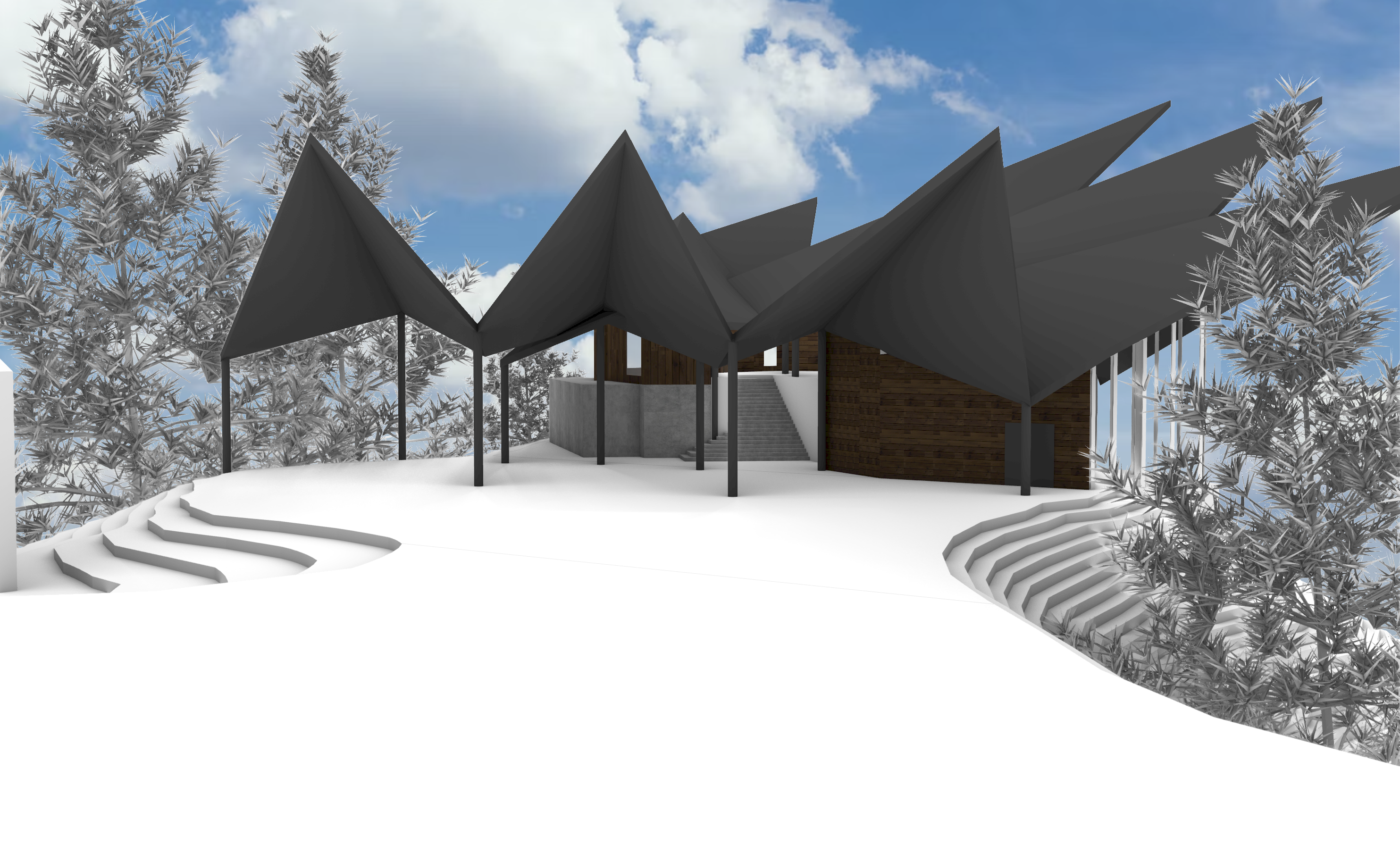 make the dark wood in this photo lighter make the roof a black standing seam roof give the render soft textures make the ground look realistic but with light soft ground color