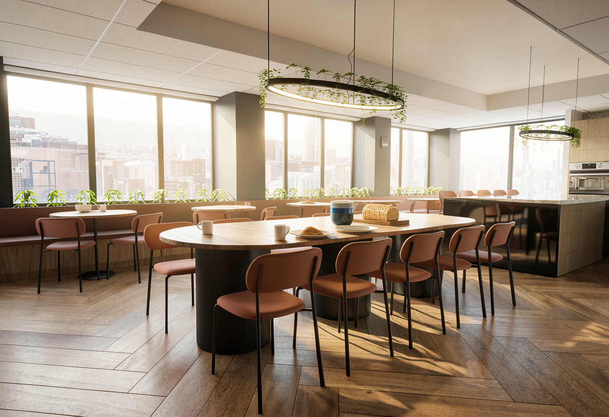 this is an interior render of a back of house ktitchen area in an office workplace do not make any adjustments or changes to the existing scene including materials equipment furniture objects etc unless specified by the prompt on the middle black column remove the powerpoint outlet that currently exists near the top of the column