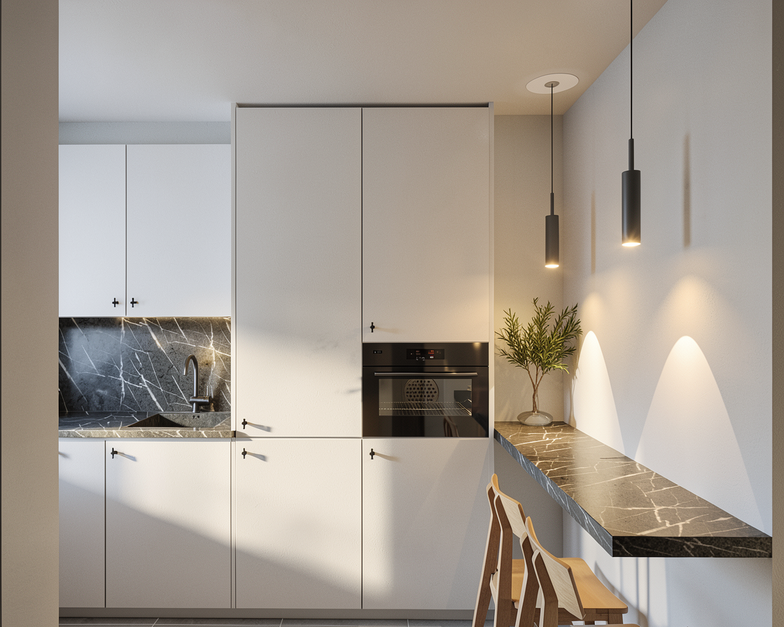 crea una imagen fotorrealista a partir de este sketchup las paredes y techos son de color gris antracita el techo tambien