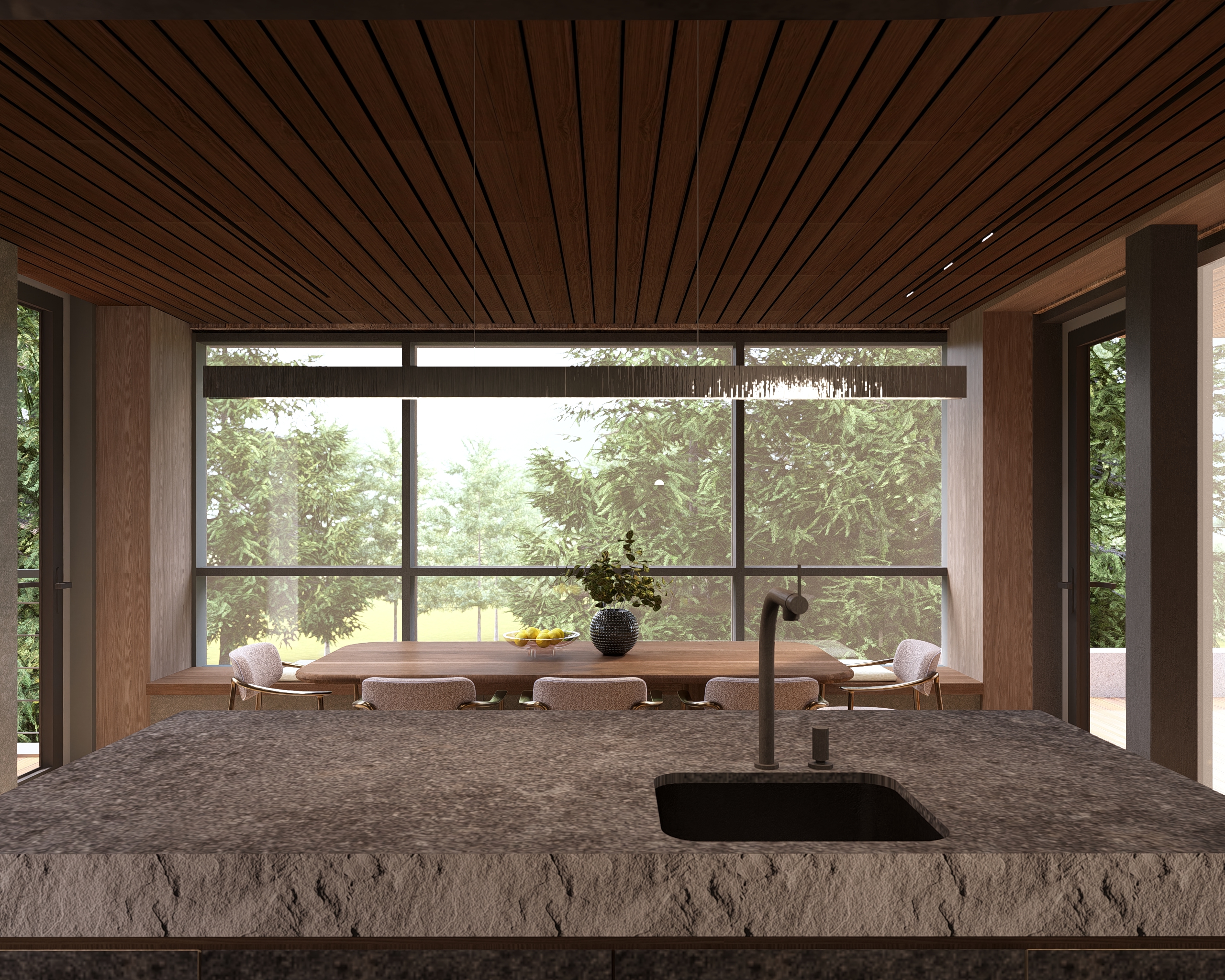 strictly edit the uploaded reference image of this modern wooden kitchen interior preserve 100 exact geometry shapes layouts proportions furniture cabinet positions architecture precise original colors materials and window view outside no changes whatsoever to island counter sinks appliances doors walls ceiling beams or any elements hyper maximize photorealism by ultra upgrading textures for ultimate lifelike detail deeply grained natural wood cabinets with realistic varnish sheen and wood pores matte veined granite quartz island countertop with subtle mineral flecks and imperfections glossy metallic sink faucet with brushed finish smooth plaster walls with faint micro textures ensure professional grade reflections on all glossy shiny surfaces countertop faucet hood with precise specular highlights realistic light bounces and no distortions perfect sophisticated lighting and light play warm ambient overhead spots casting soft volumetric shadows and highlights on counters wood subtle natural window light maintaining exact directions colors for depth do not alter sources intensity or geometry beautify subtly only on kitchen island counter and open shelves add a sleek wooden cutting board with fresh herbs basil lemons in bowl on counter stylish ceramic utensil holder with wooden spoons minimalist potted green plant and artisanal bread loaf on shelf perfectly matching style scale colors without clutter or changes hyper realistic architectural photography 8k flawless original composition and geometry