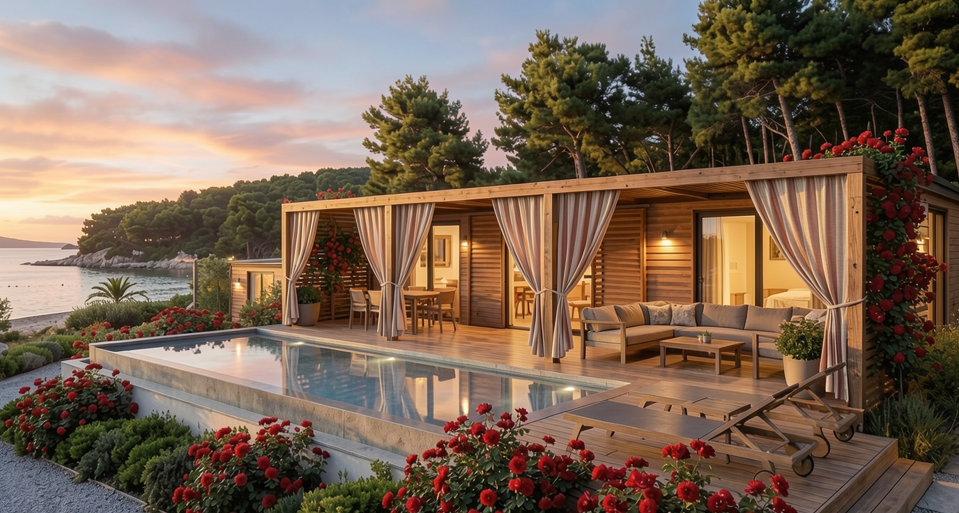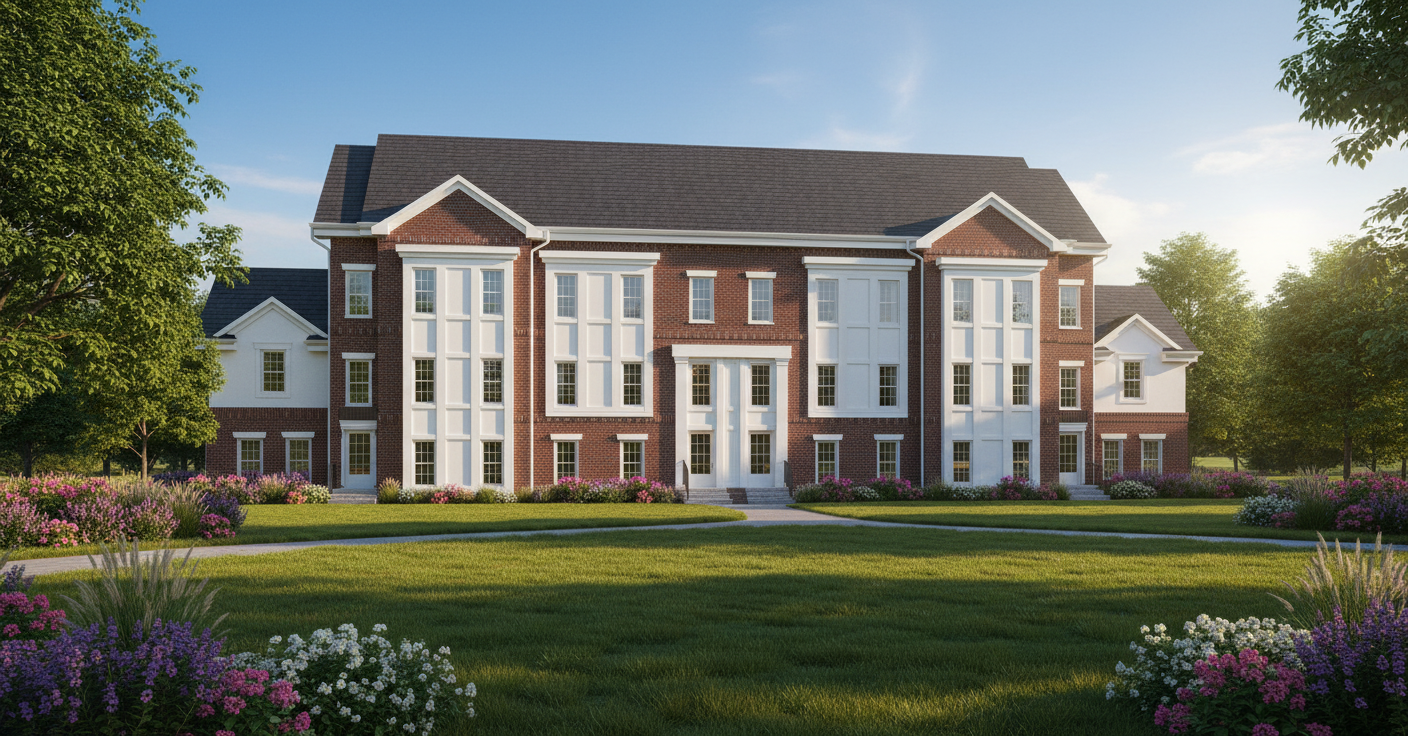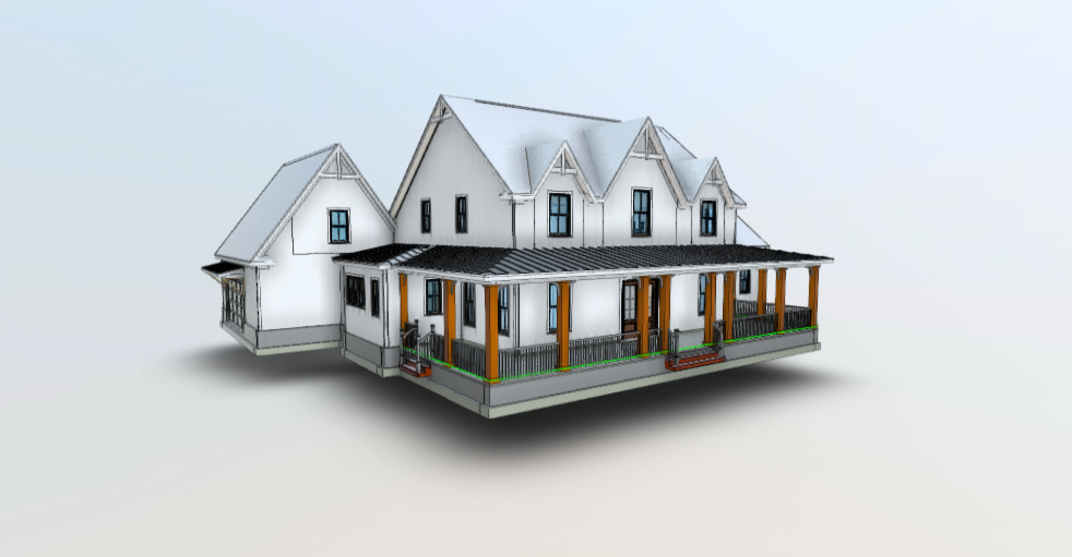 make as photorealistic as possible while keeping textures the same as selection professional landscaping in a lightly wooded scene with good lighting white siding dark shingle roof only asphalt driveway with sidewalk leading to front porch no chimney more landscaping in front with smaller driveway