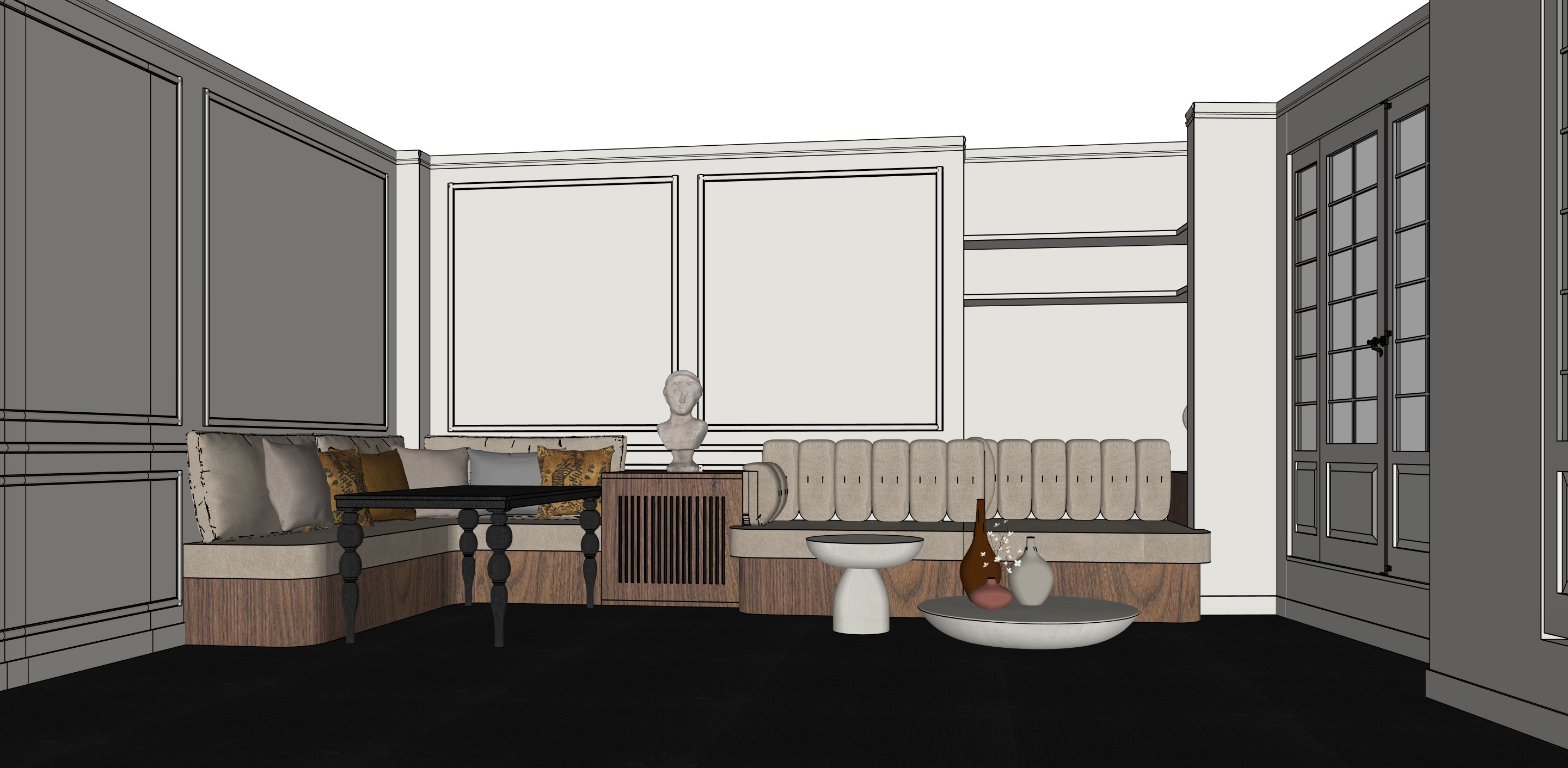the walls are in light greige with subtle mouldings it is a parisian apartment on the 6th floor of a parisian building add ancient books on the shelves add cushions on the sofa on the right the shelves are the same color as the walls the floors are in black japanese wood there are no books at the same level of the sofa