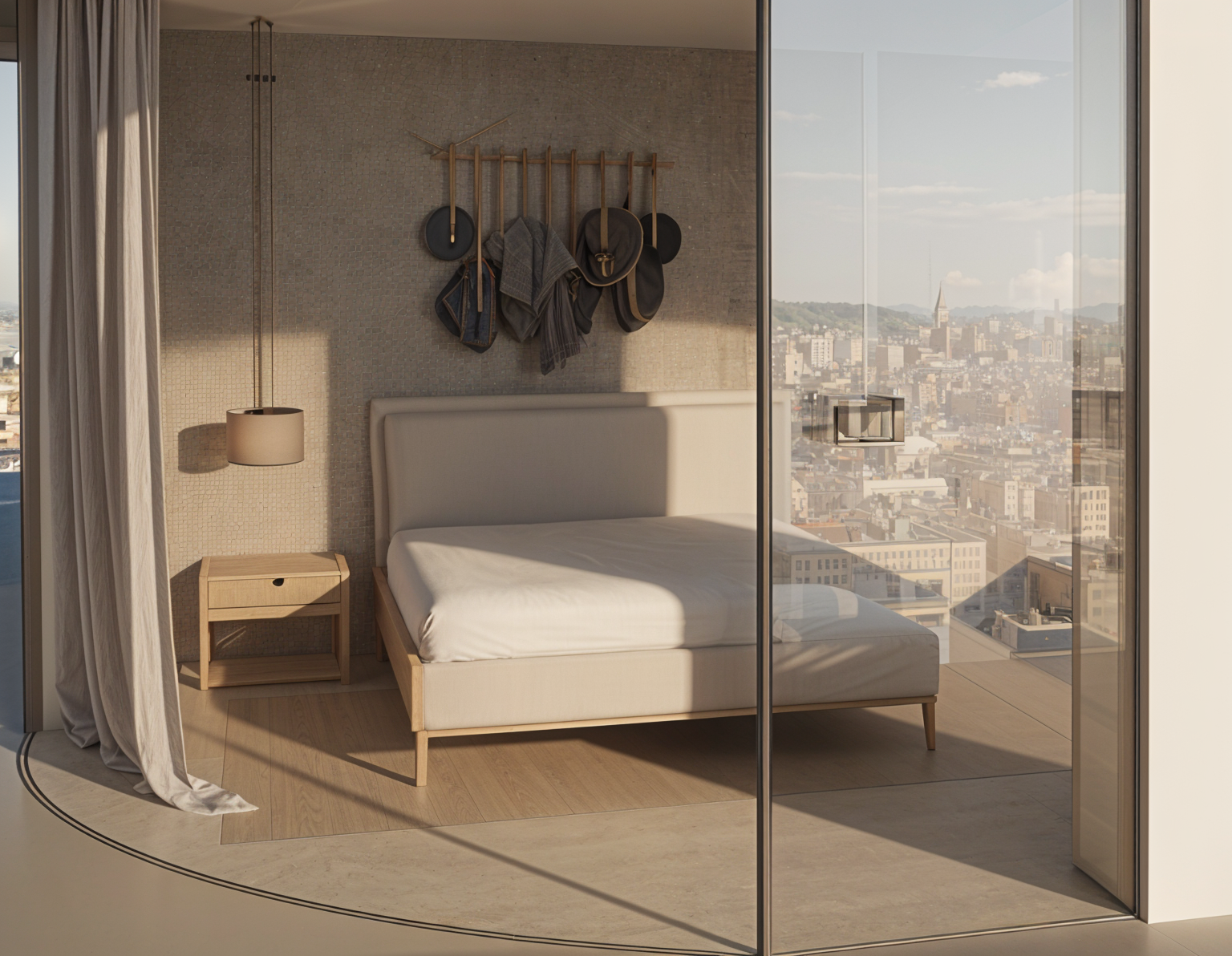 interior shot render a modern bedroom with a soothing and elegant atmosphere use a soft neutral color palette for the wall apply a textured light gray with subtle patterns the bed should have a crisp white sheet and a light gray padded headboard add black feather wall art above the bed for contrast choose light wood bedside tables with a natural grain hang two minimalist pendant lights in matte beige the floor should be a smooth medium taupe with a soft beige rug underneath the bed add floor length sheer curtains in pale gray on the right suggesting a gentle breeze with two terrace chairs overall create a serene and sophisticated ambiance architecture