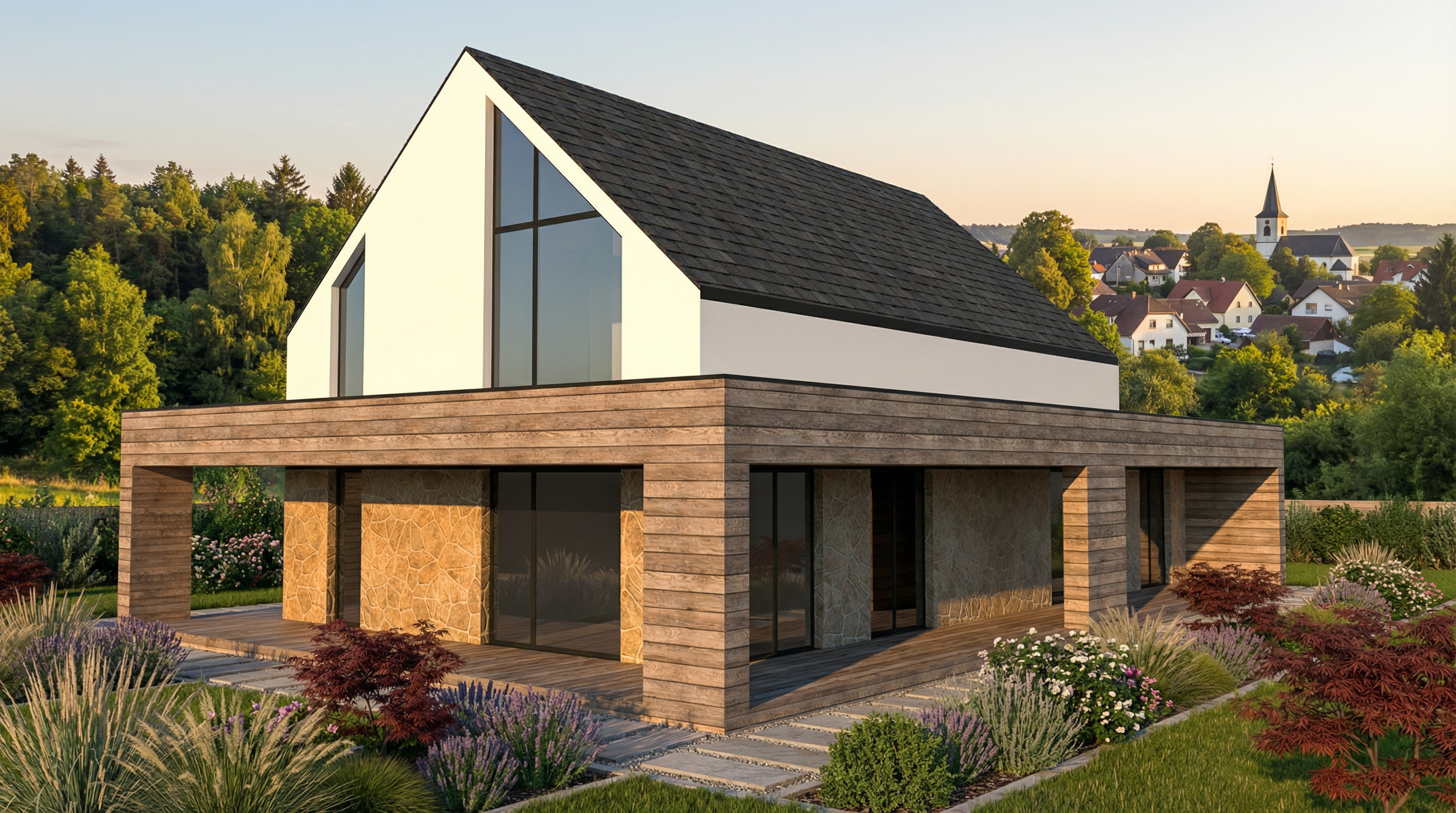 create a nice garden with small trees and flowers and a forest and small country town in the background create a nice and modern garden arrangement in front of the house