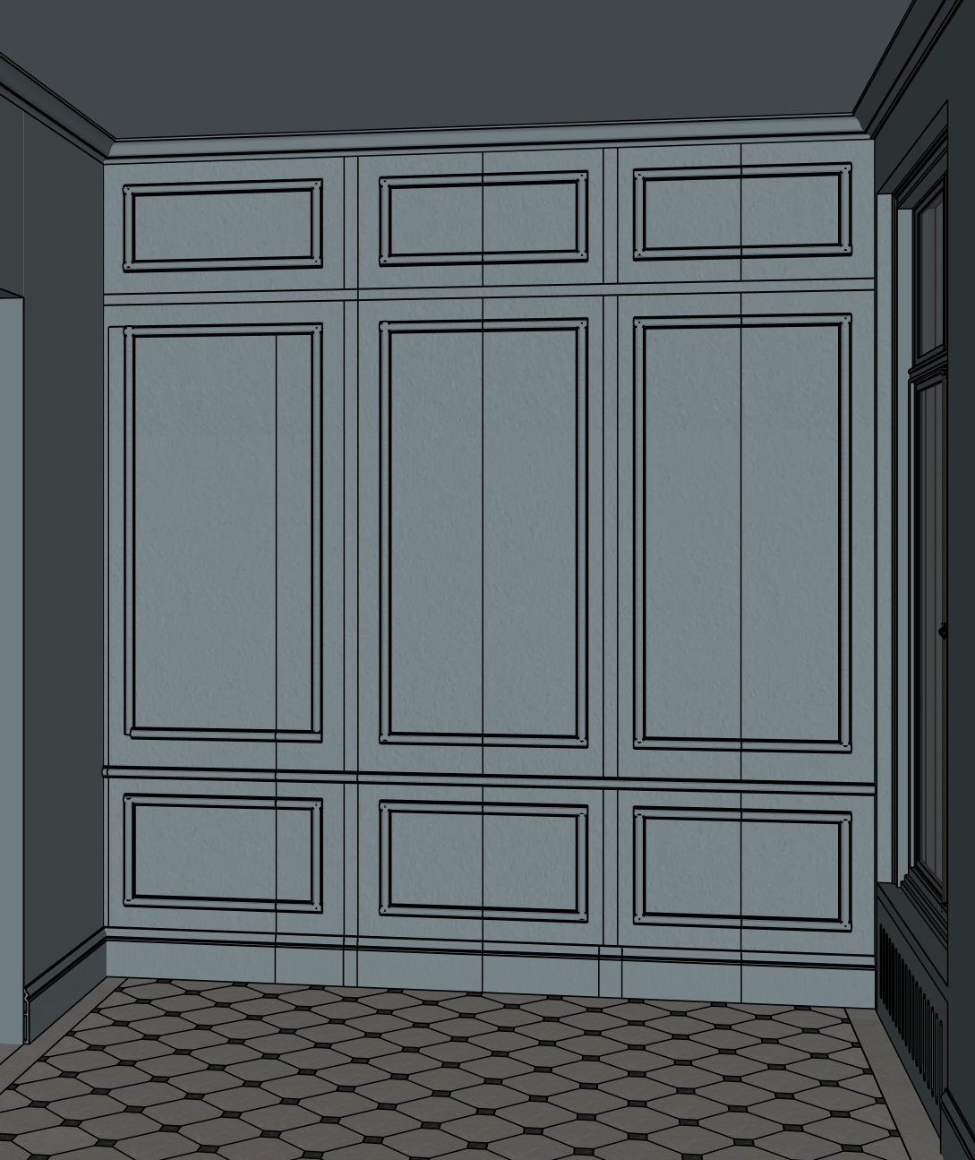 the blue color of the millwork is farrow and ball de nimes blue https www farrow ball com fr peinture de nimes there are mouldings on the millwork it is located in a parisian building the blue should be a ittle darker the radiator cannot be seen under the window the floor is in beige and white cabochon like this https fr pinterest com pin 51650726969638476 the frame of the window is i light greige the vertical lines which mark the doors should be visible the blue is a little darker and all the walls are in the same blue