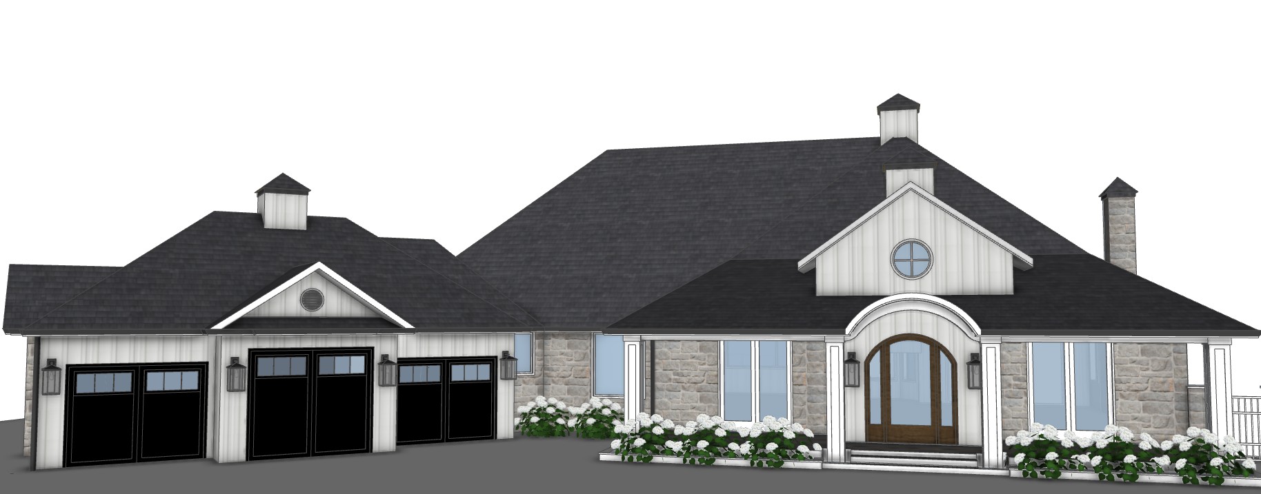 blue sky some pine trees in background warm white board and batten grey stone with overgrout fine pebbled aggregate driveway