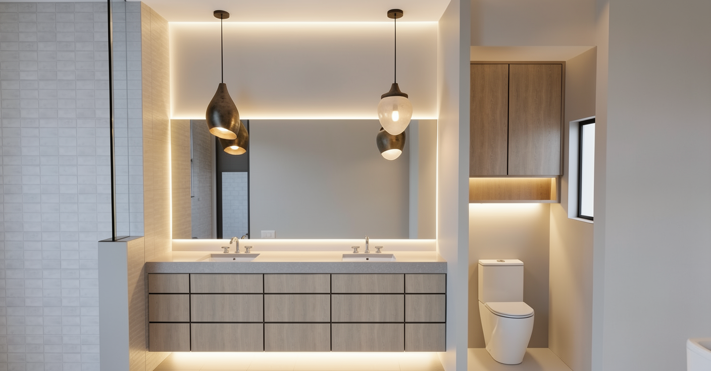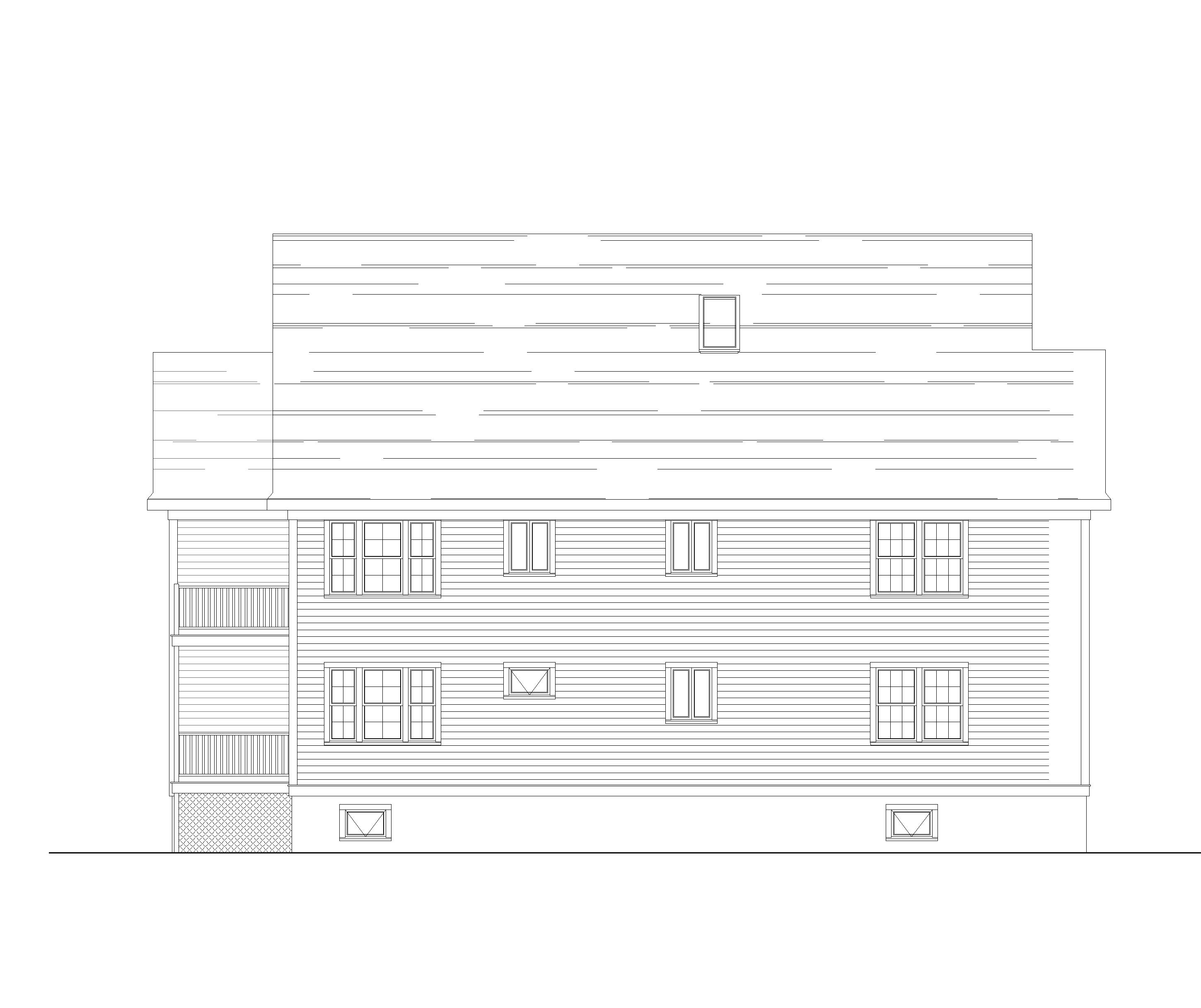 a dark grey shingle roof reddish brown siding cream colored trim with black framed windows grass landscaping with sidewalk and street int eh foreground and right side
